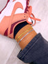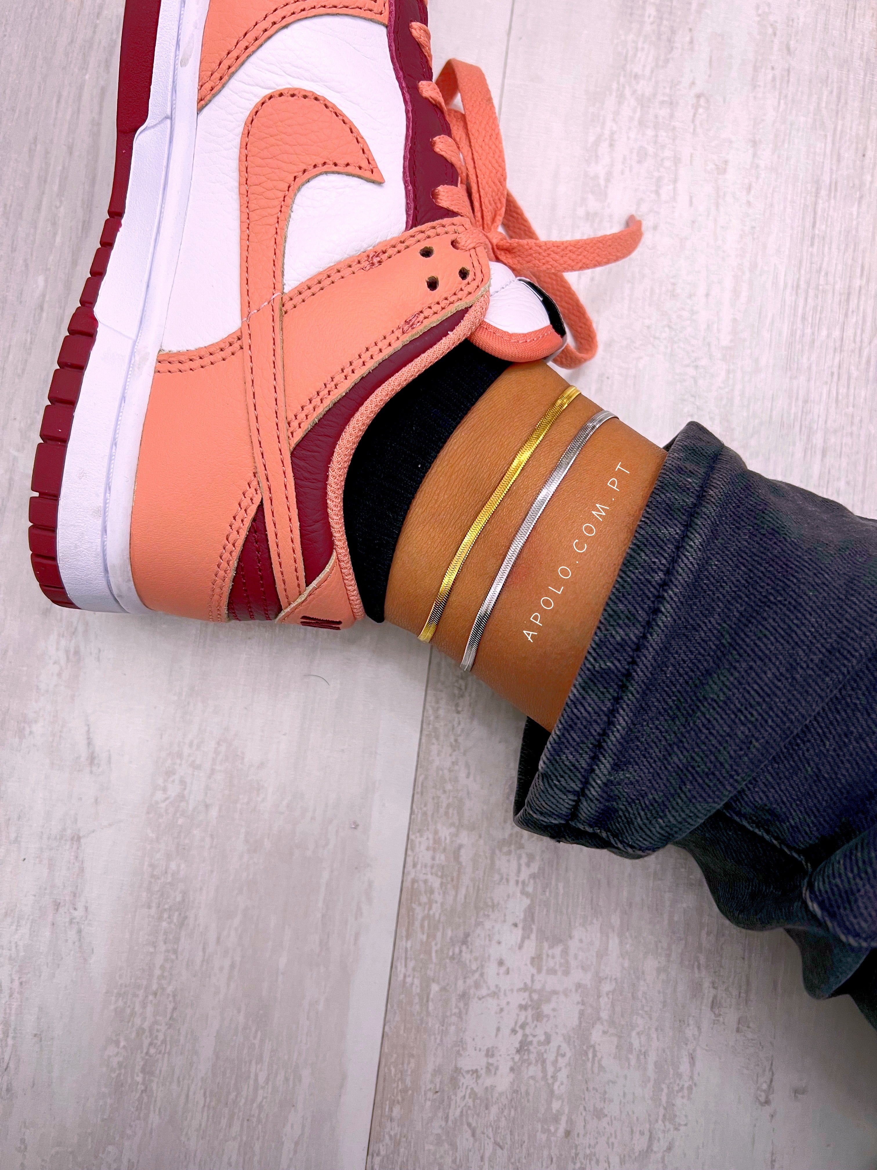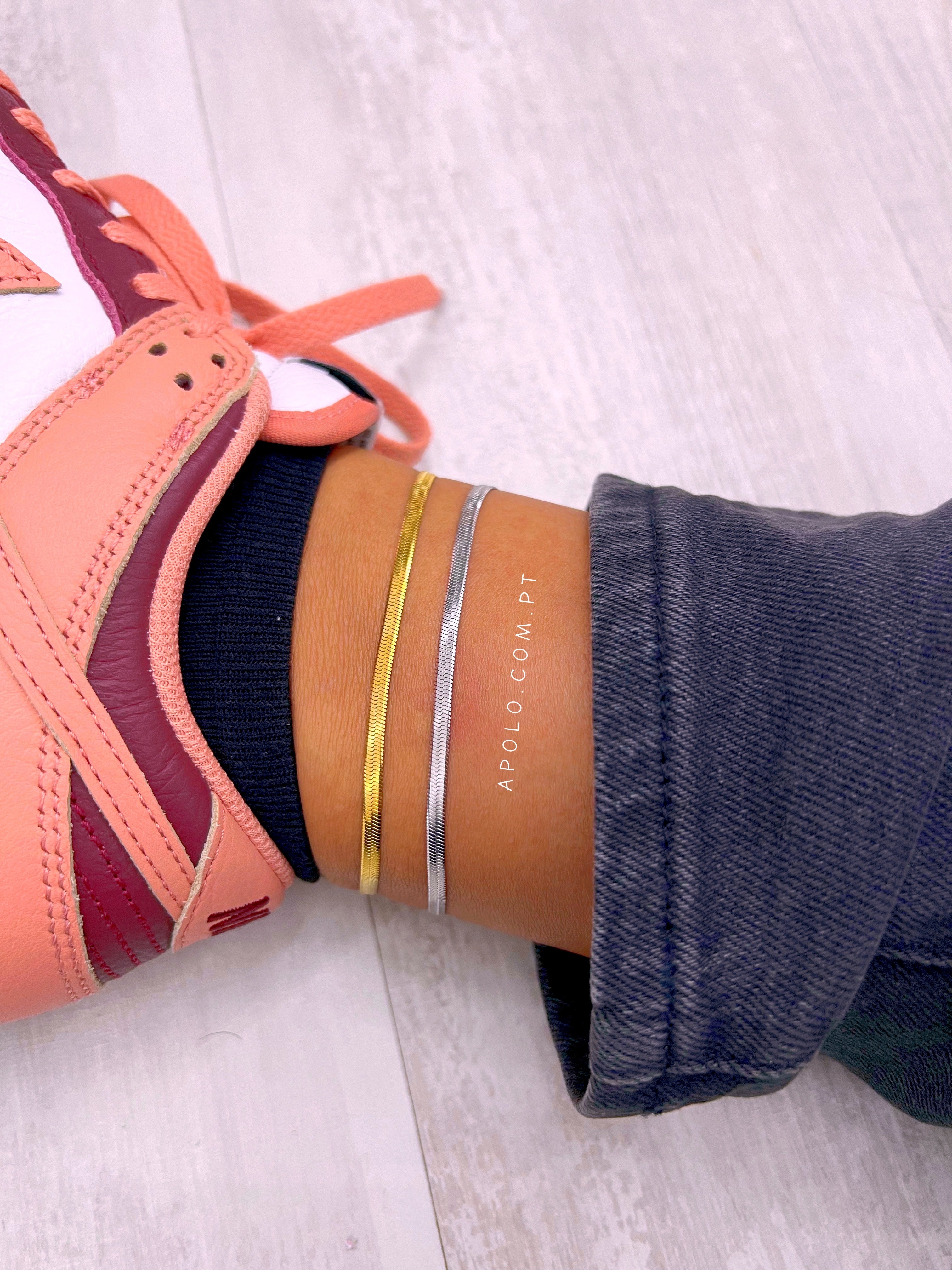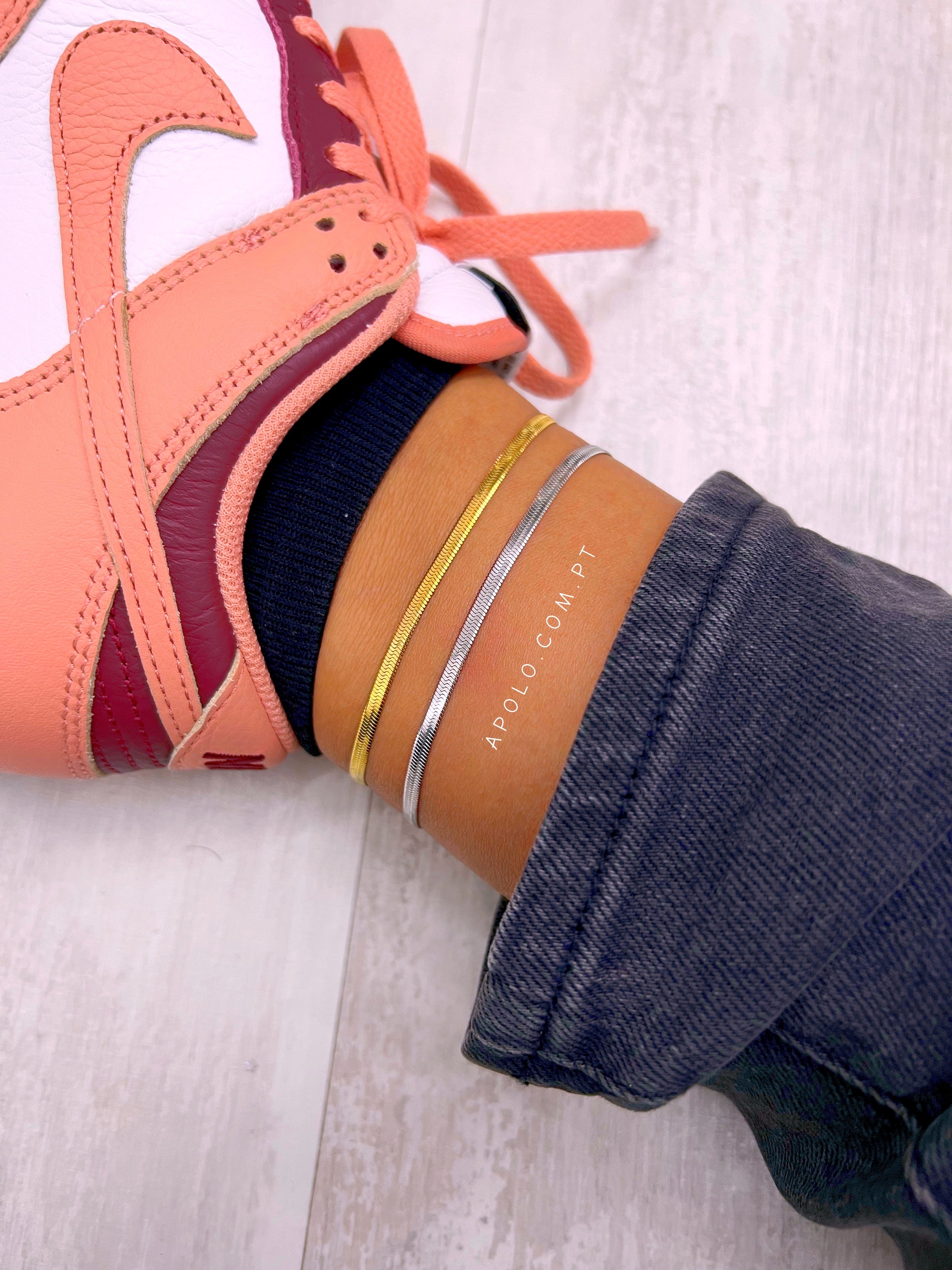 Pulseira de pé em malha achatada e fininha. Largura da malha de 3mm.