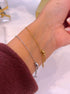 Pulseira fininha e delicada, com pormenores de três flores ao centro e pérolas.