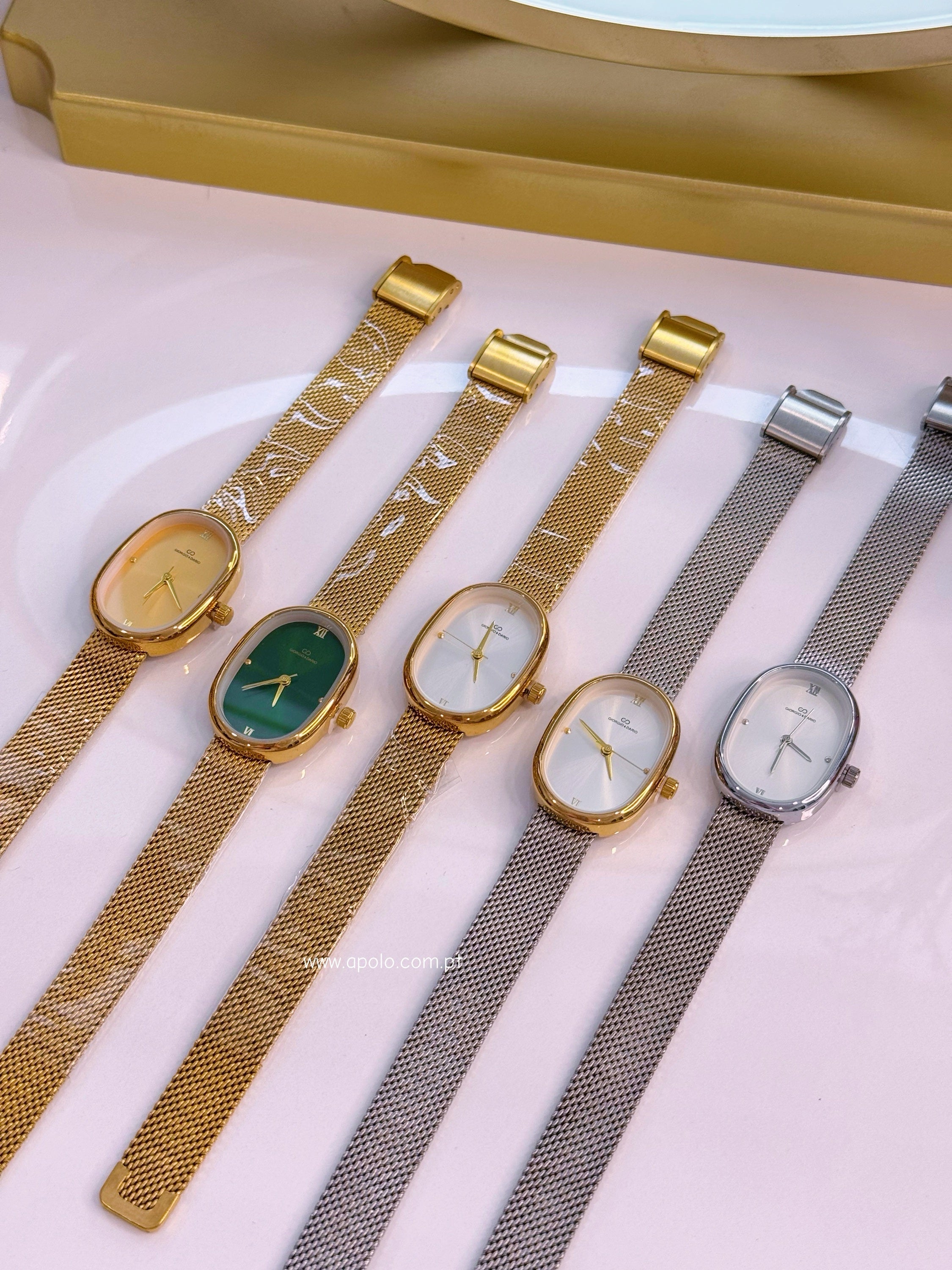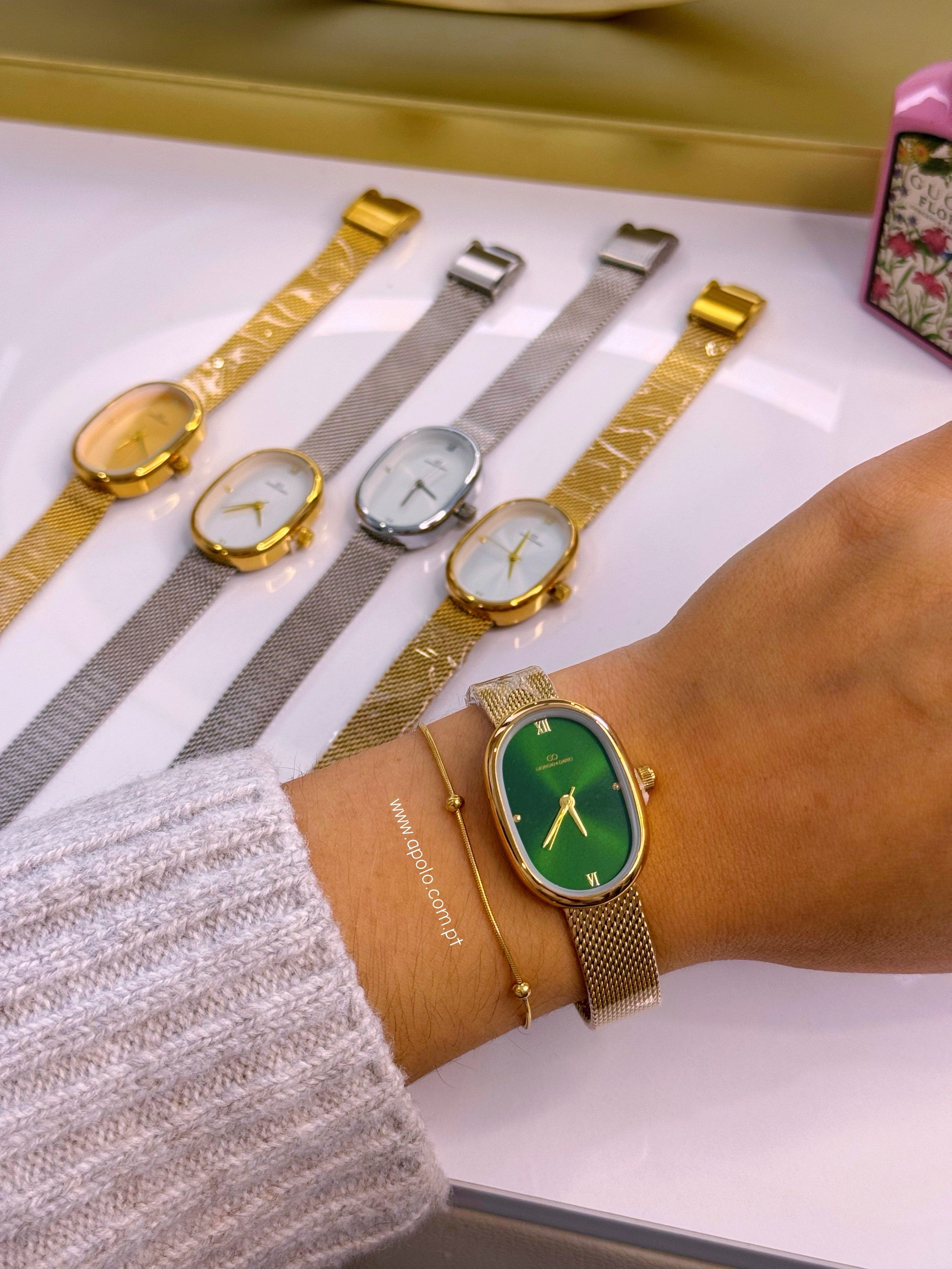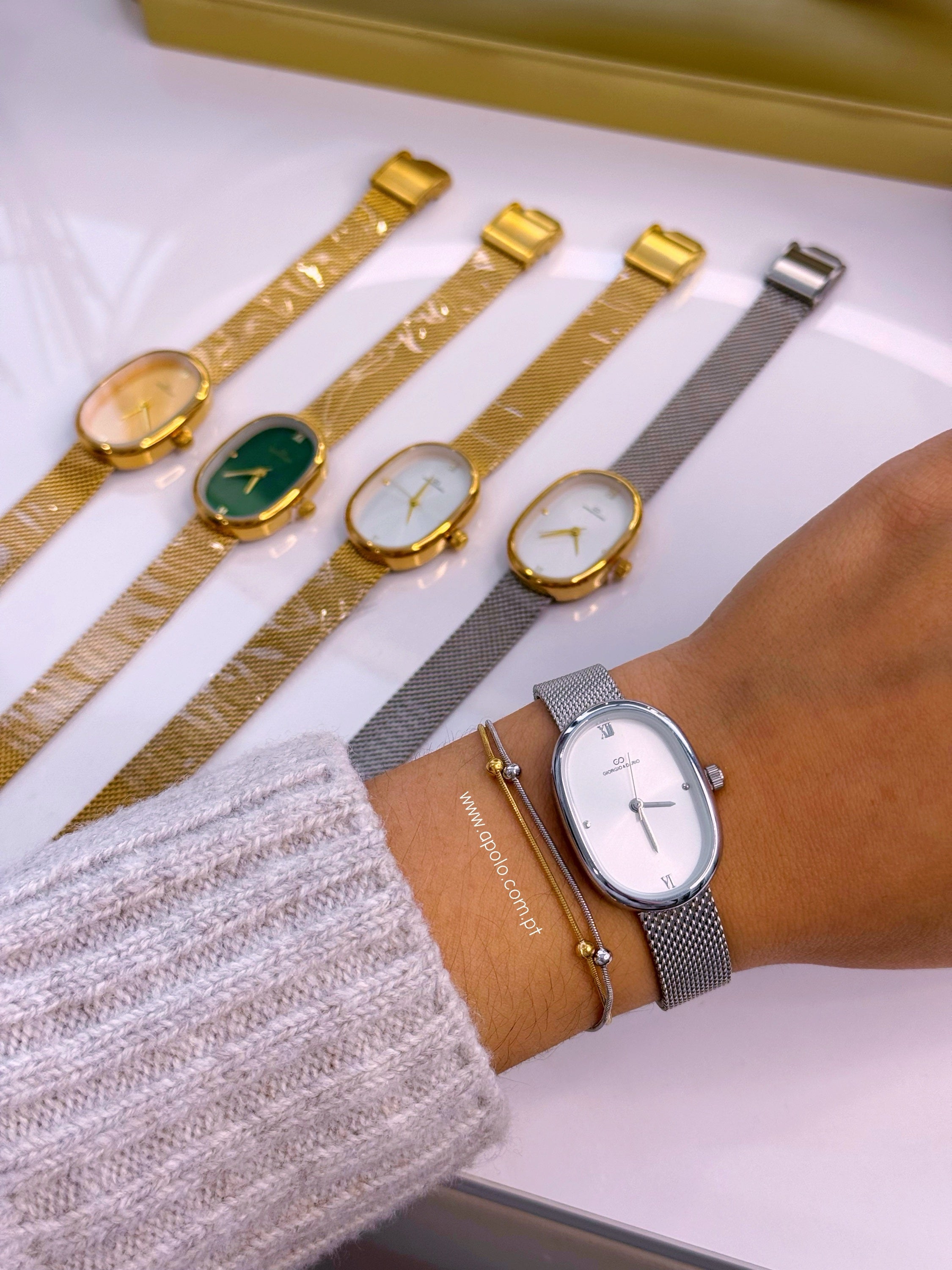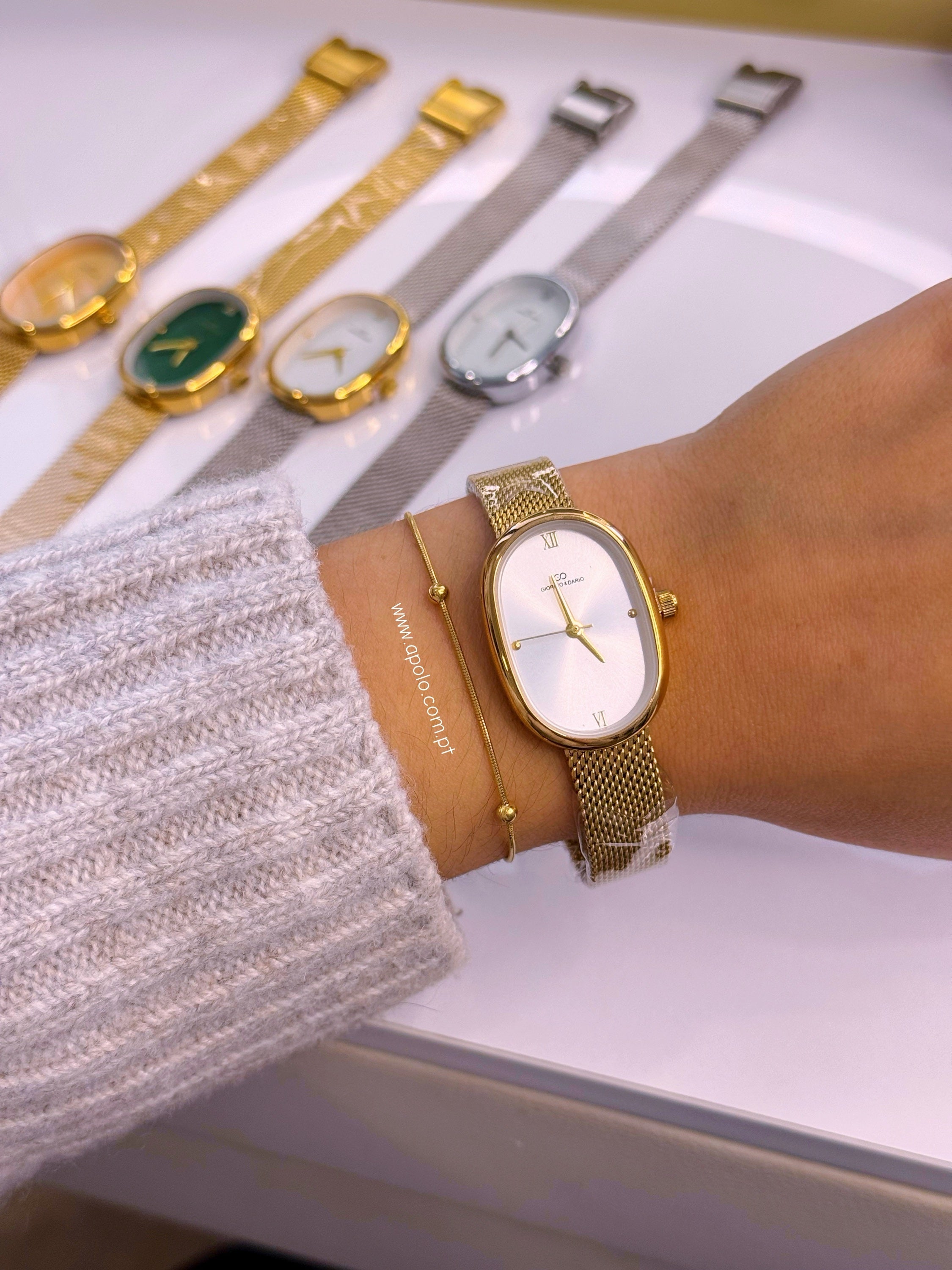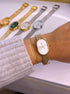Relógio analógico super elegante com bracelete fina e mostrador oval.