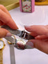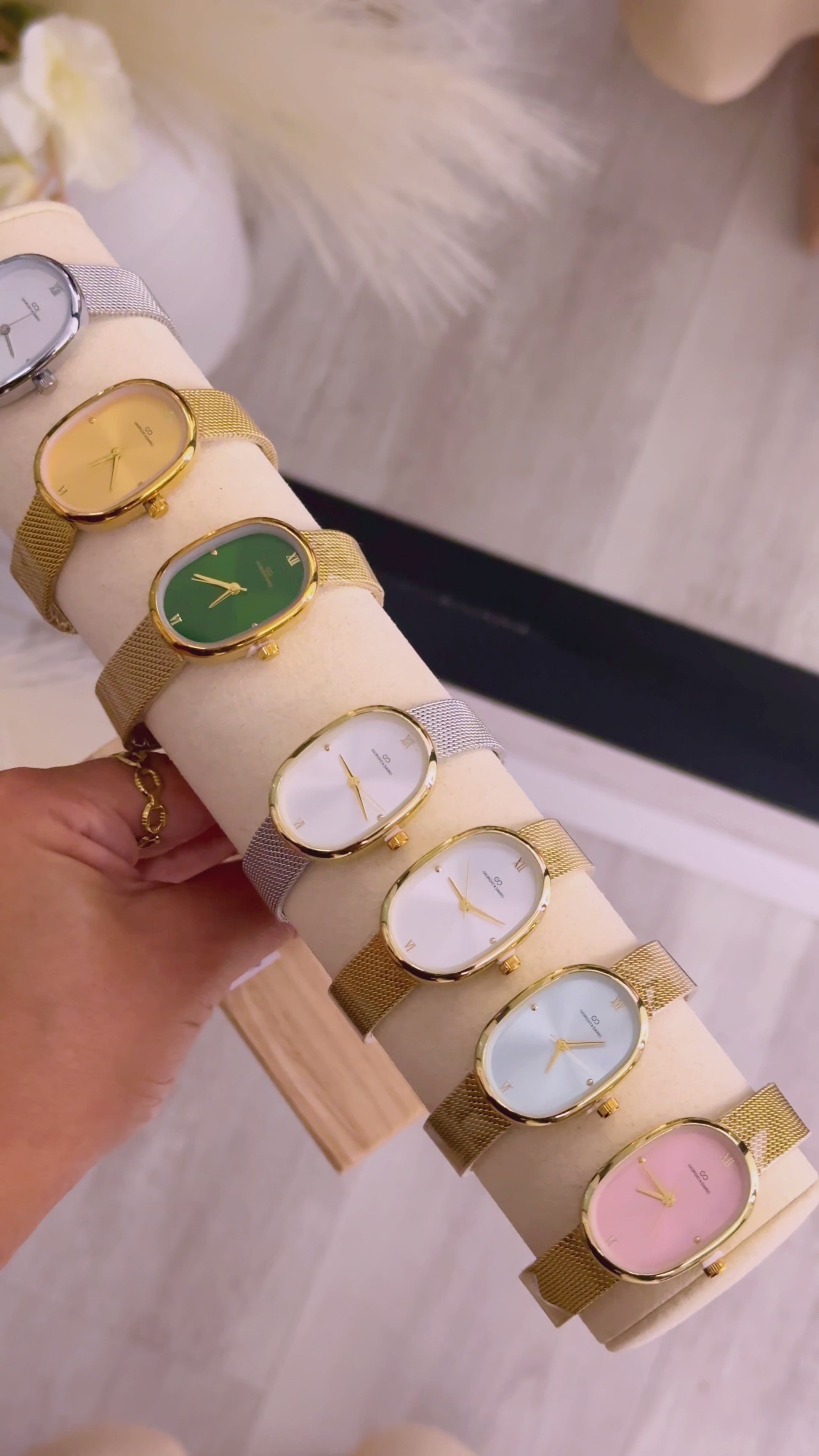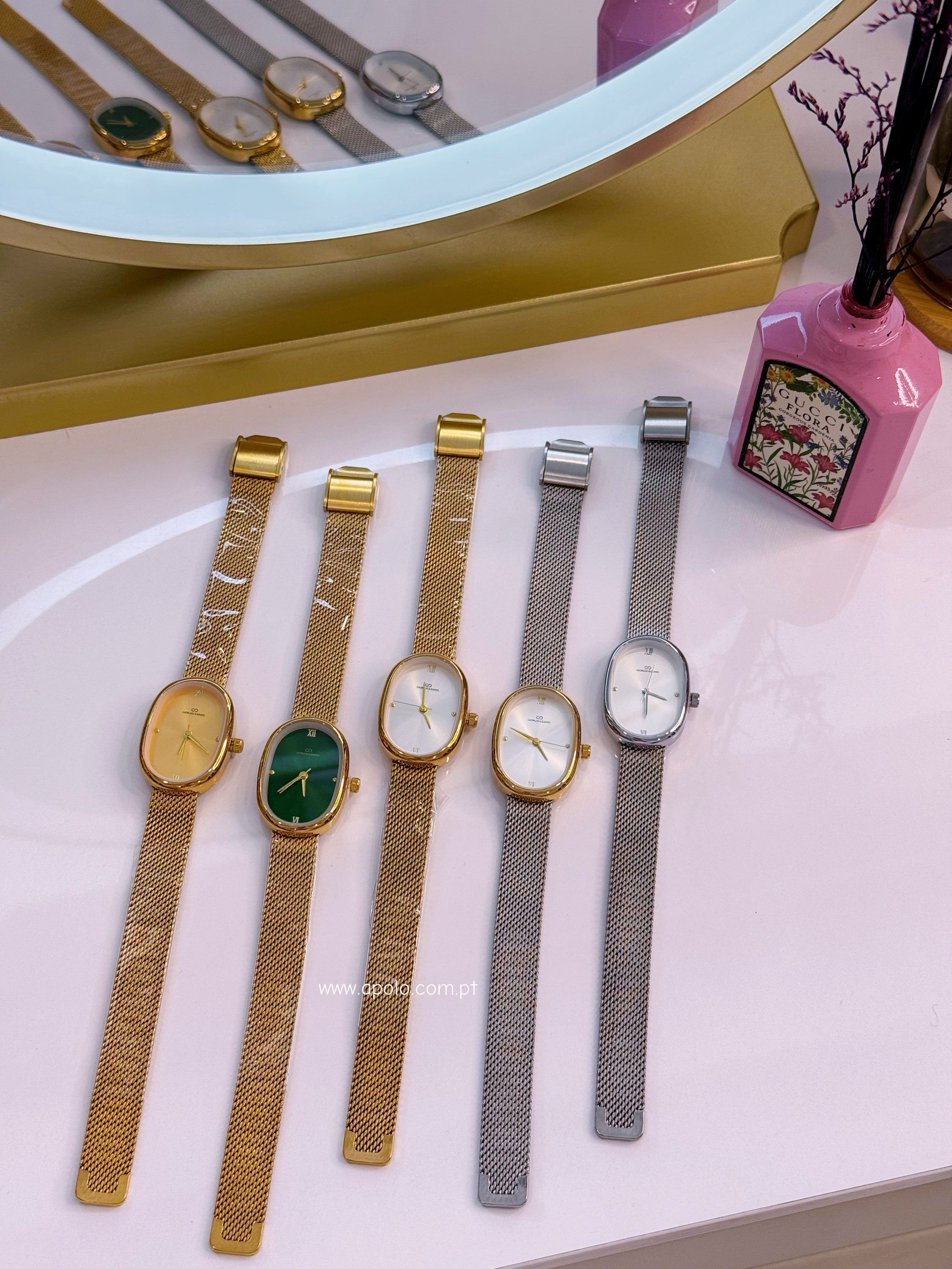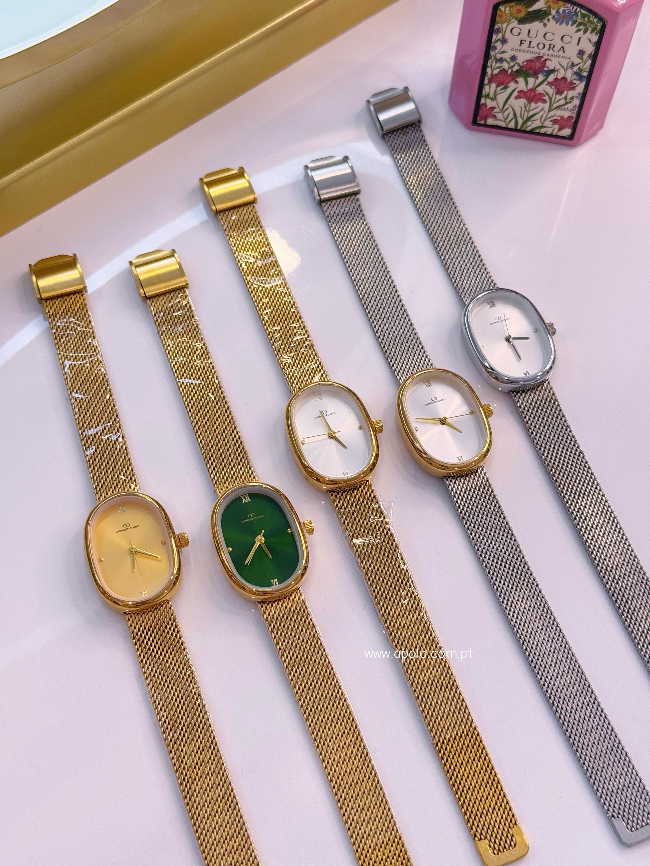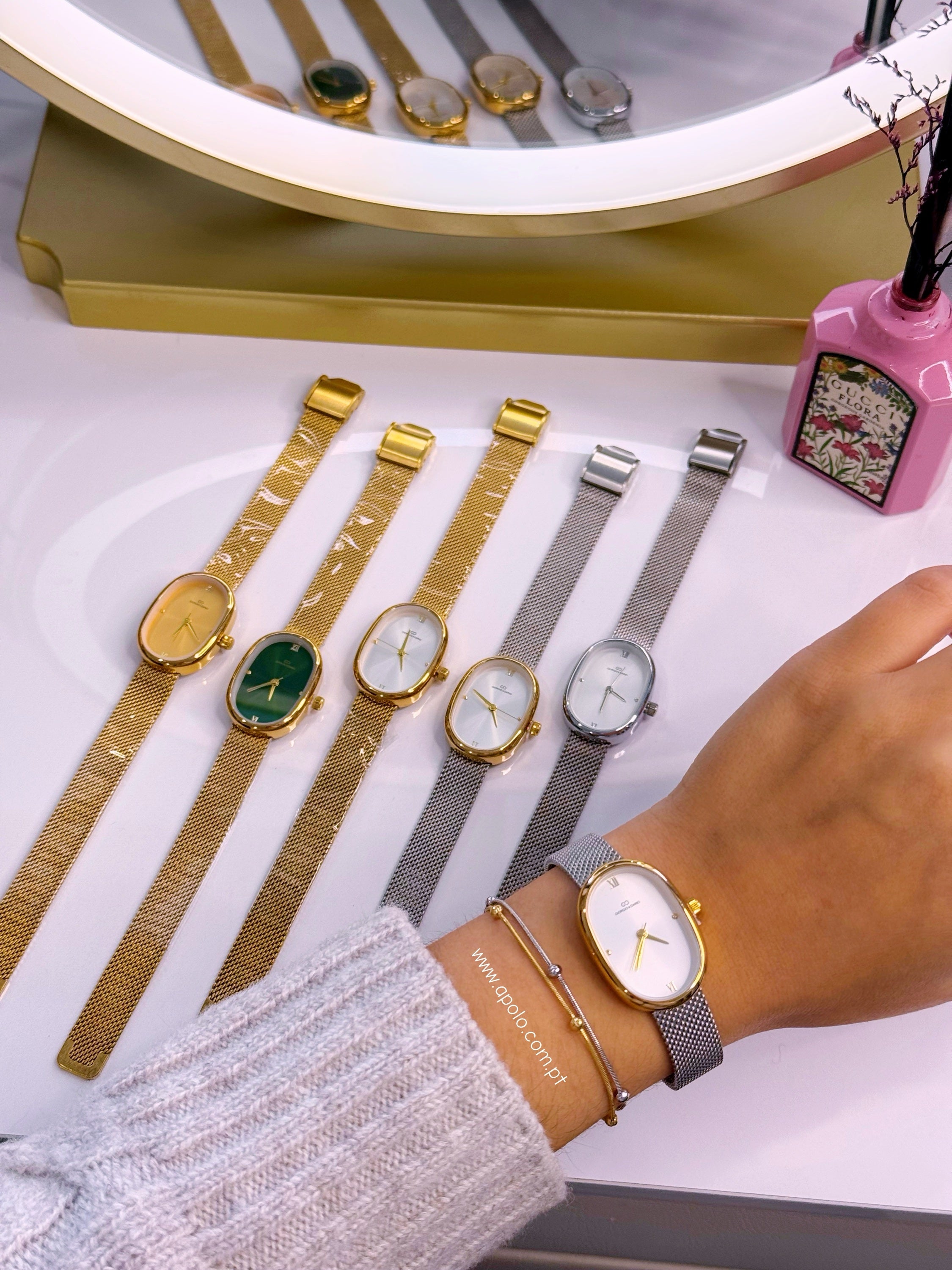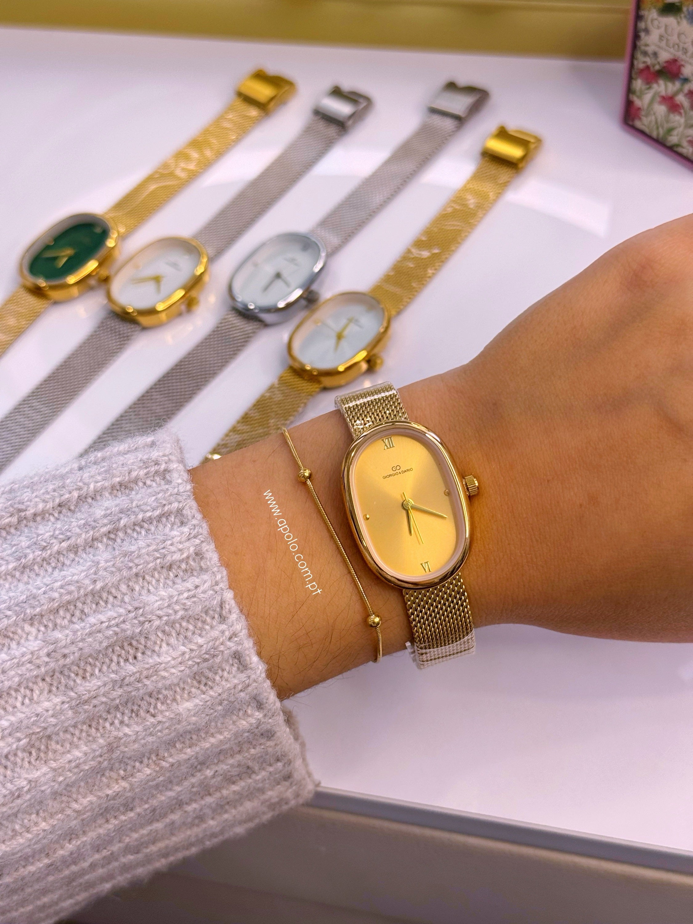 Relógio analógico super elegante com bracelete fina e mostrador oval.