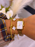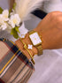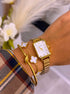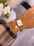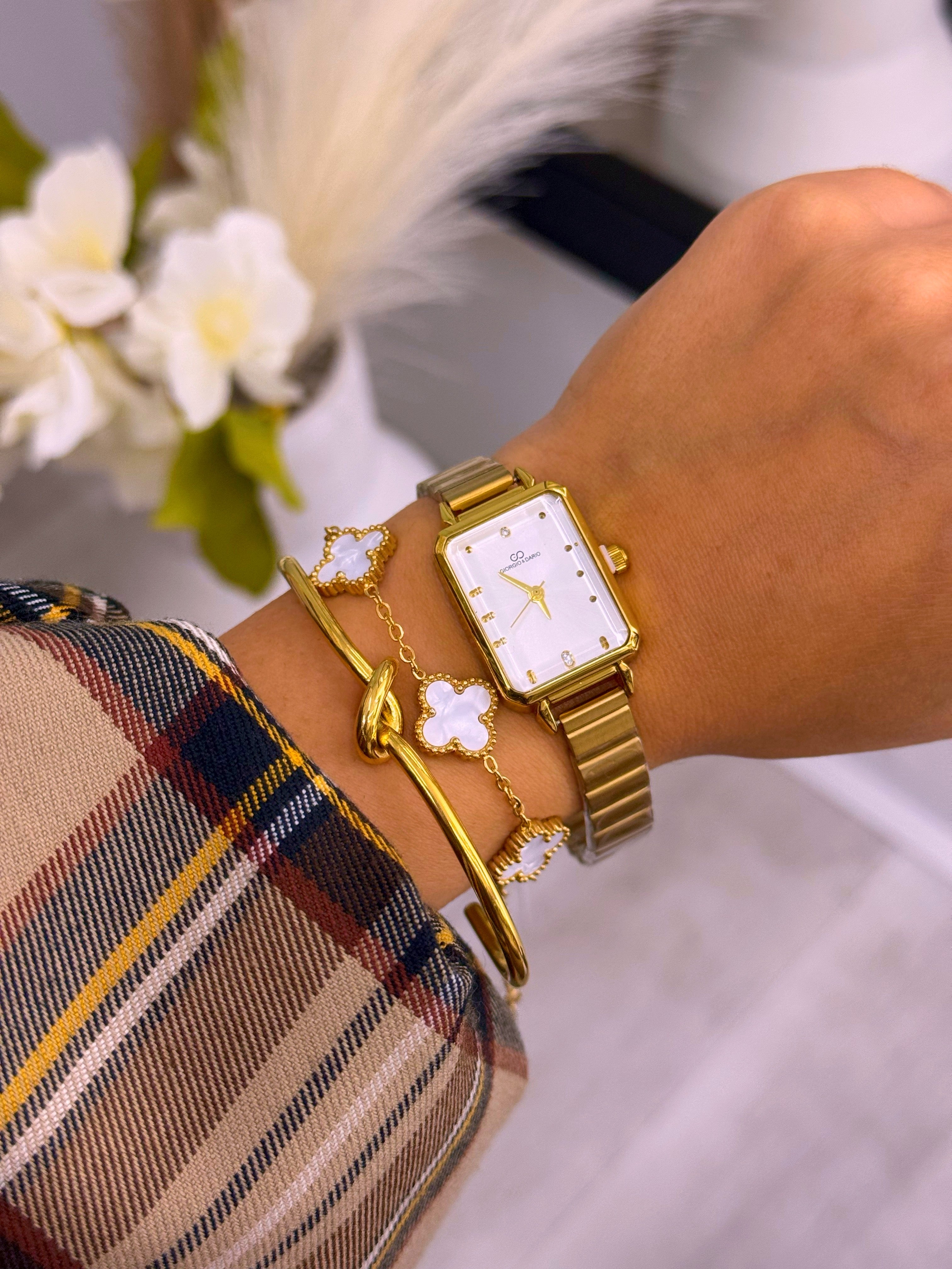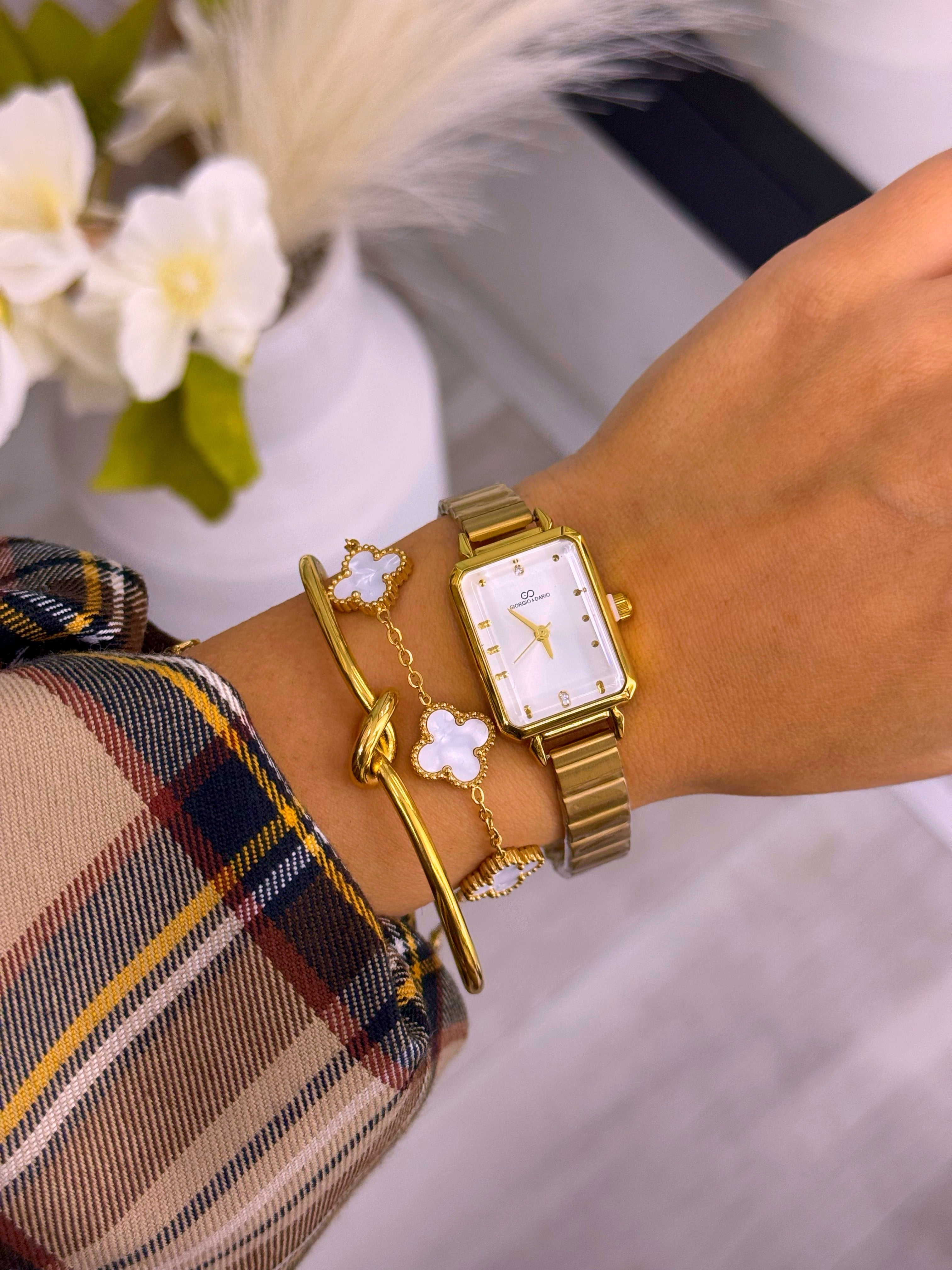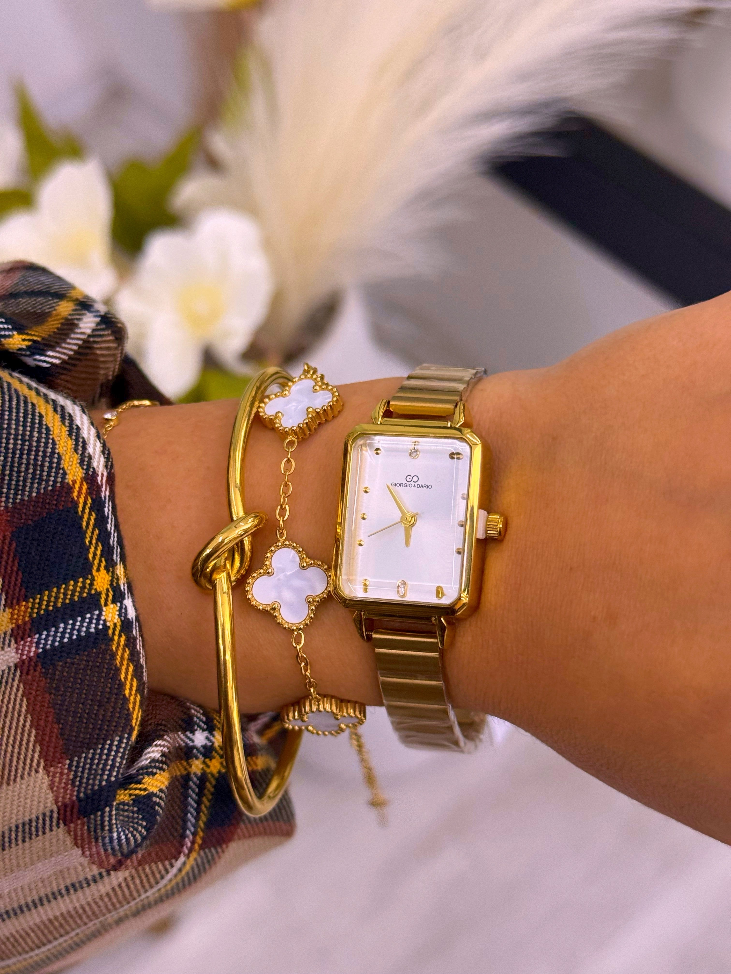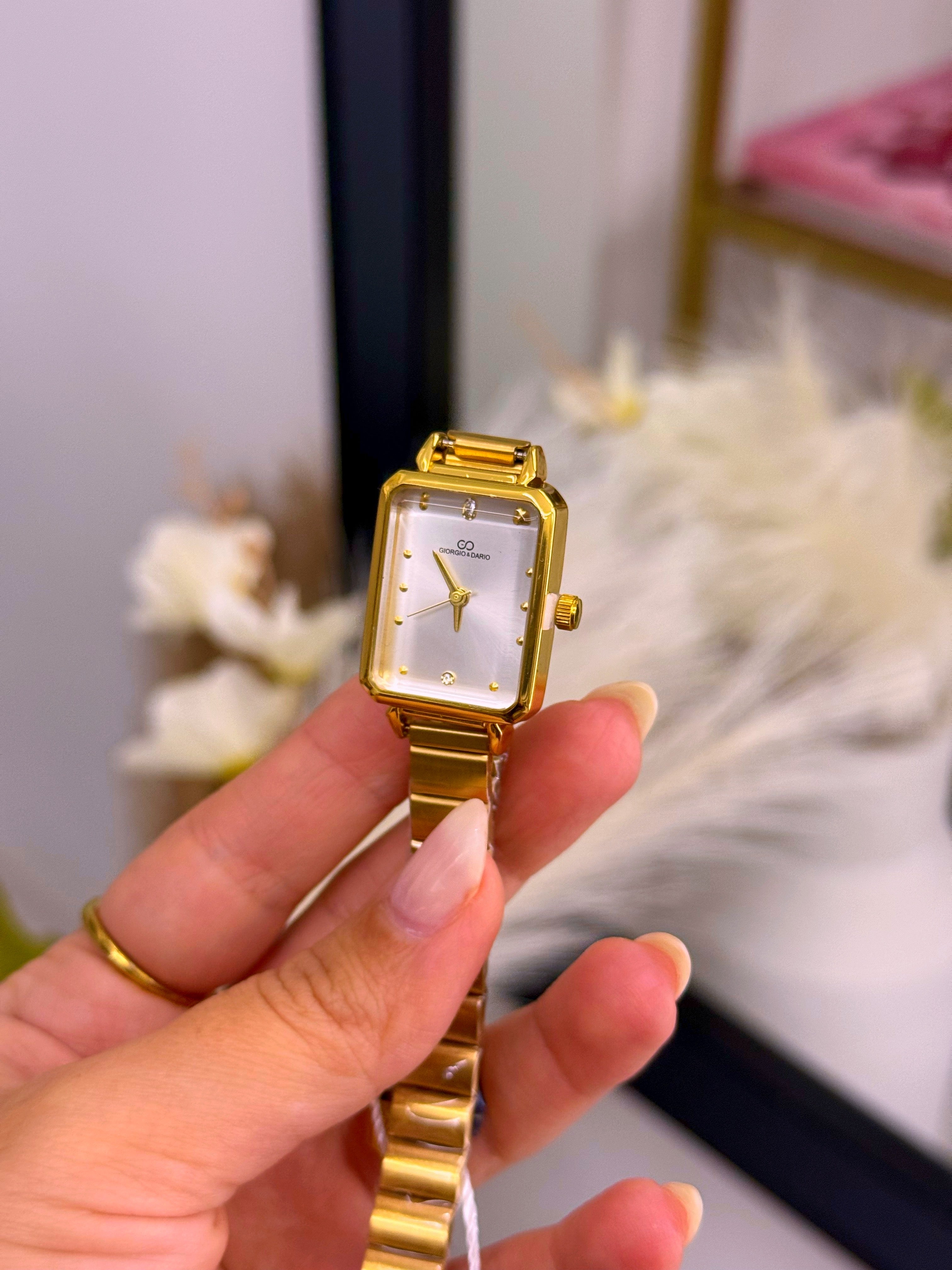 Relógio analógico dourado da marca Giorgio & Dario com fundo branco.