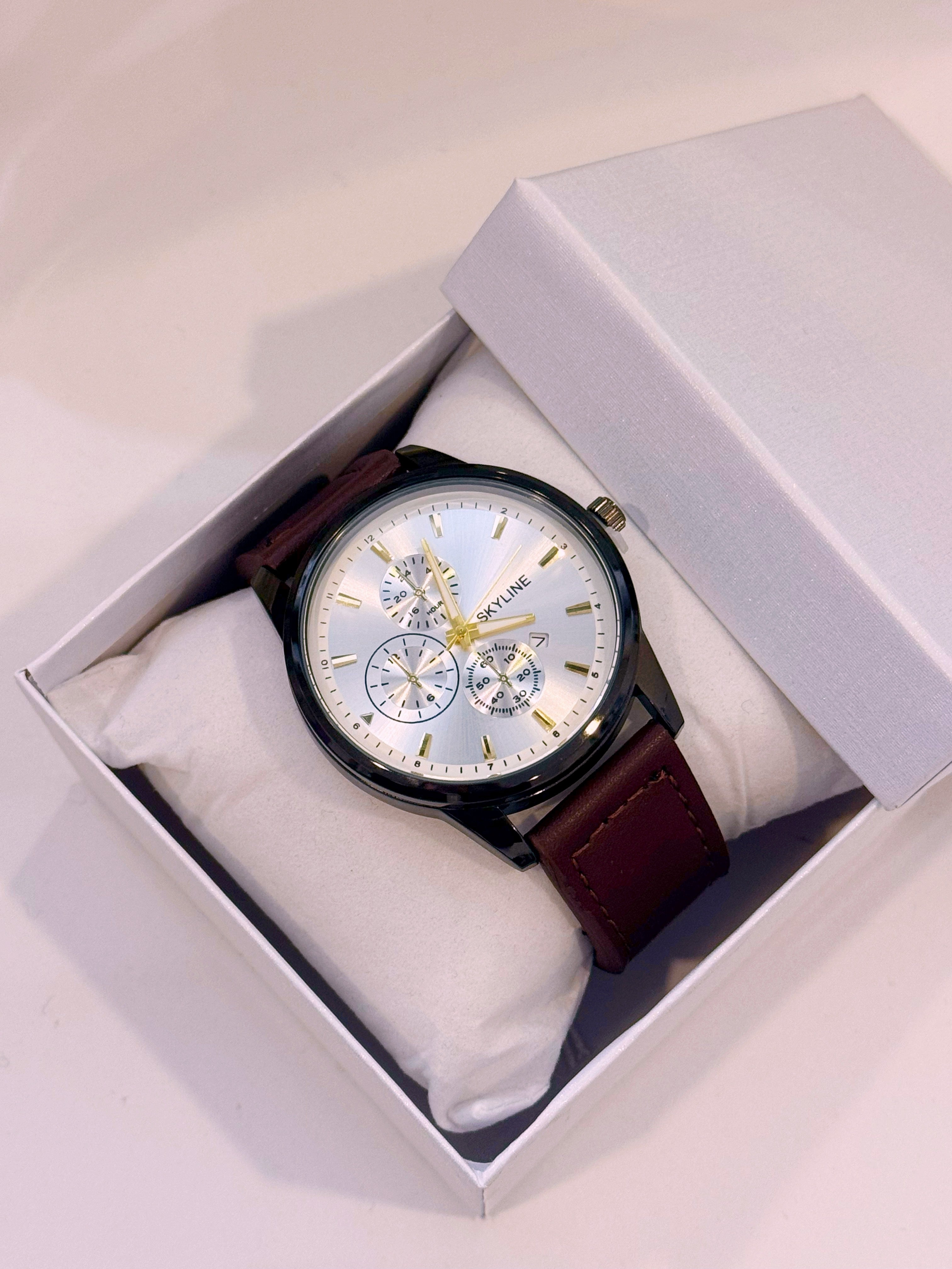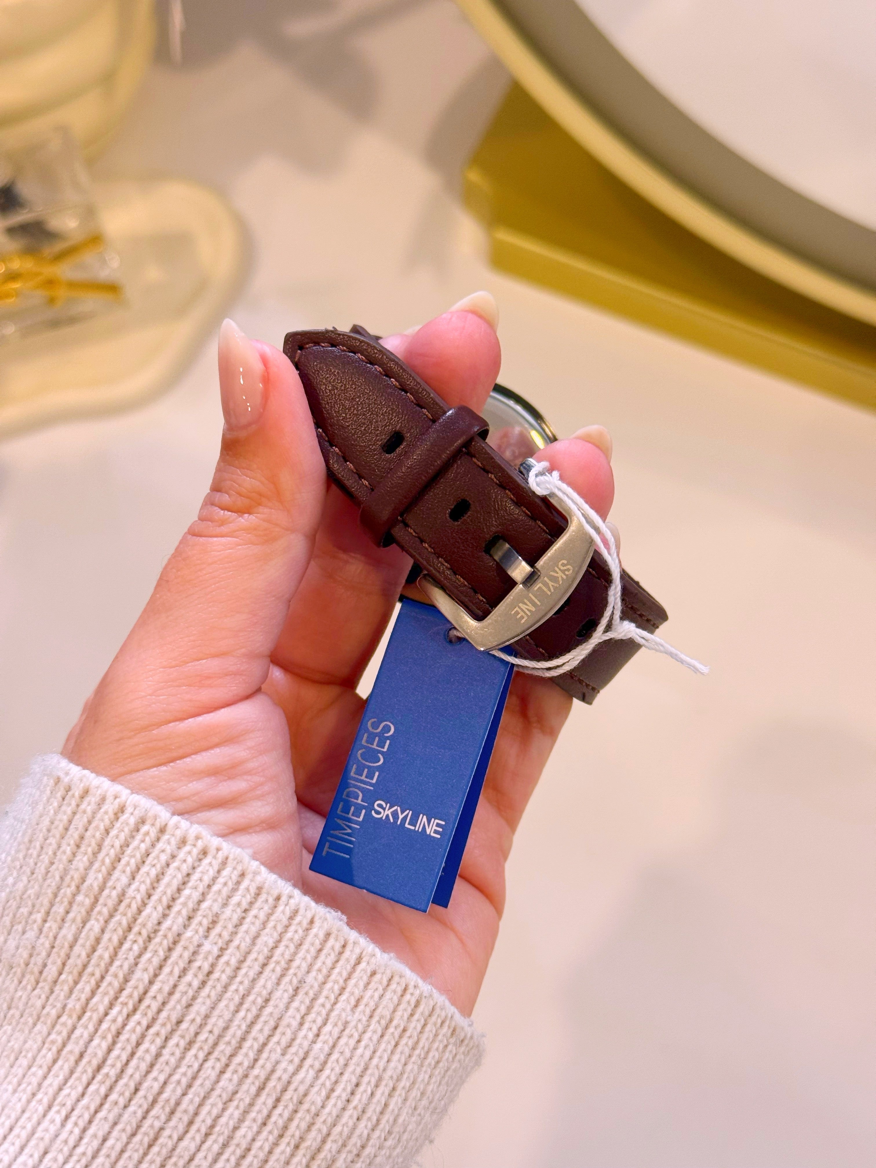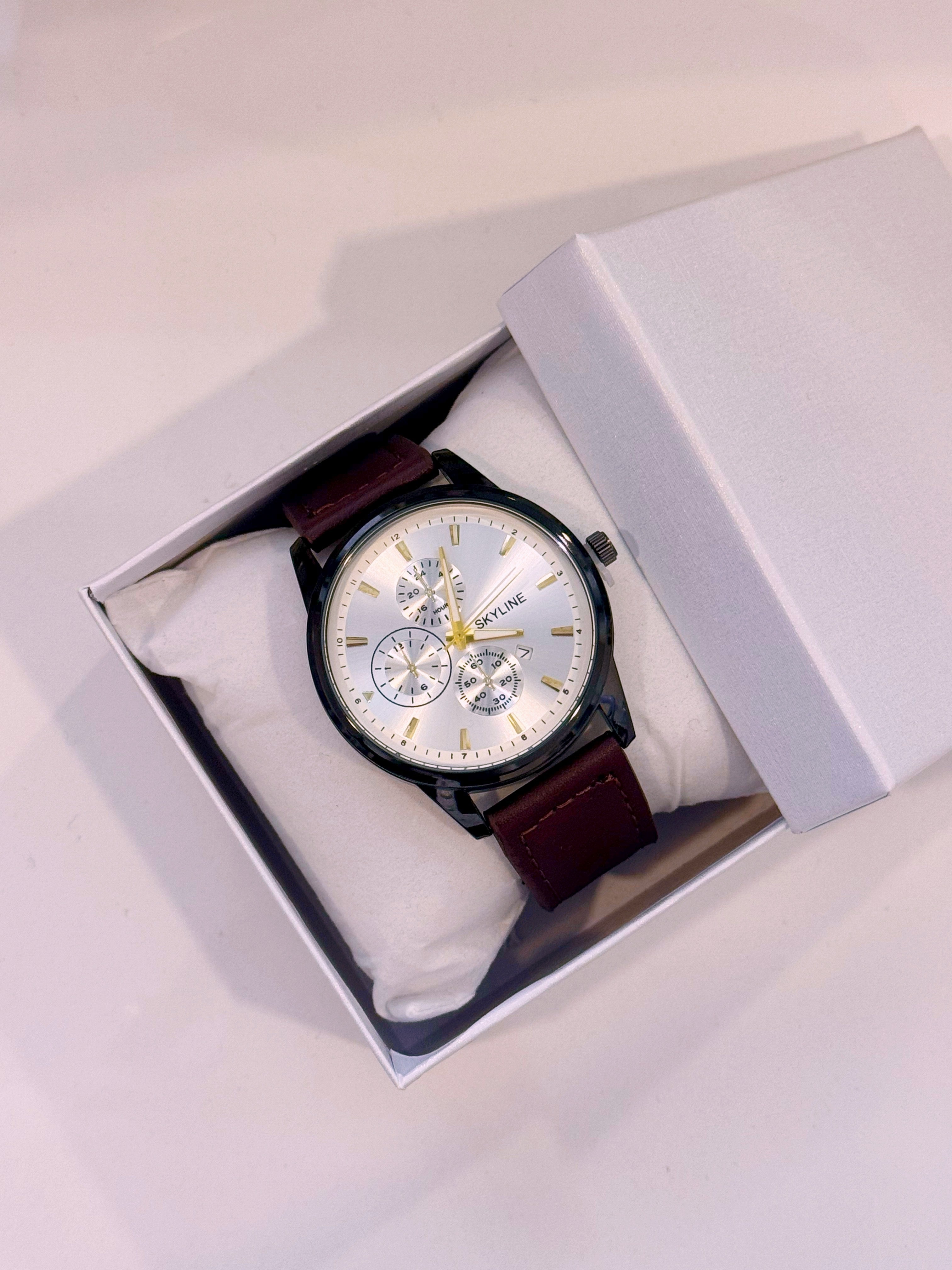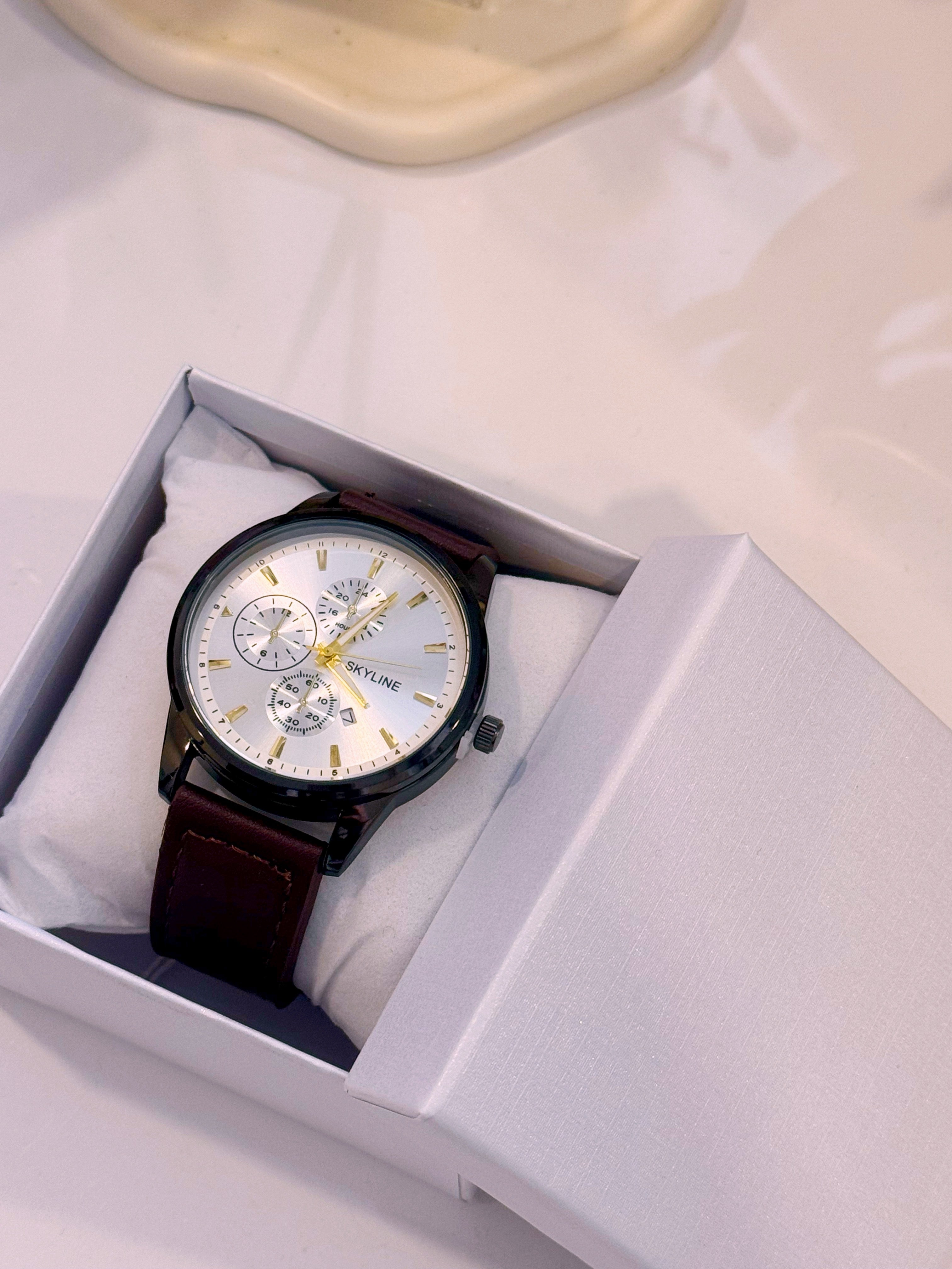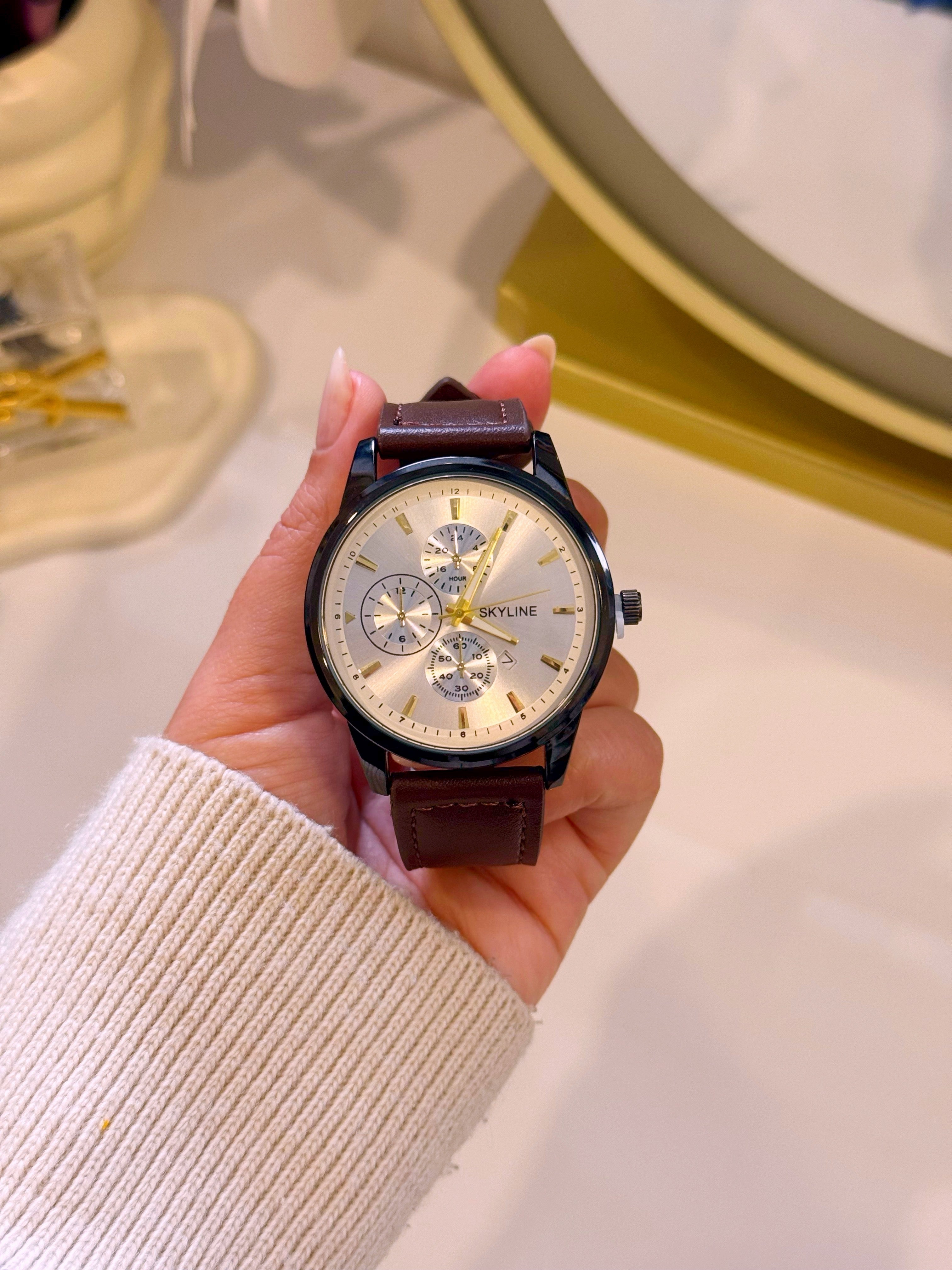 Relógio Skyline em pele, analógico e com mostrador interior para o dia.