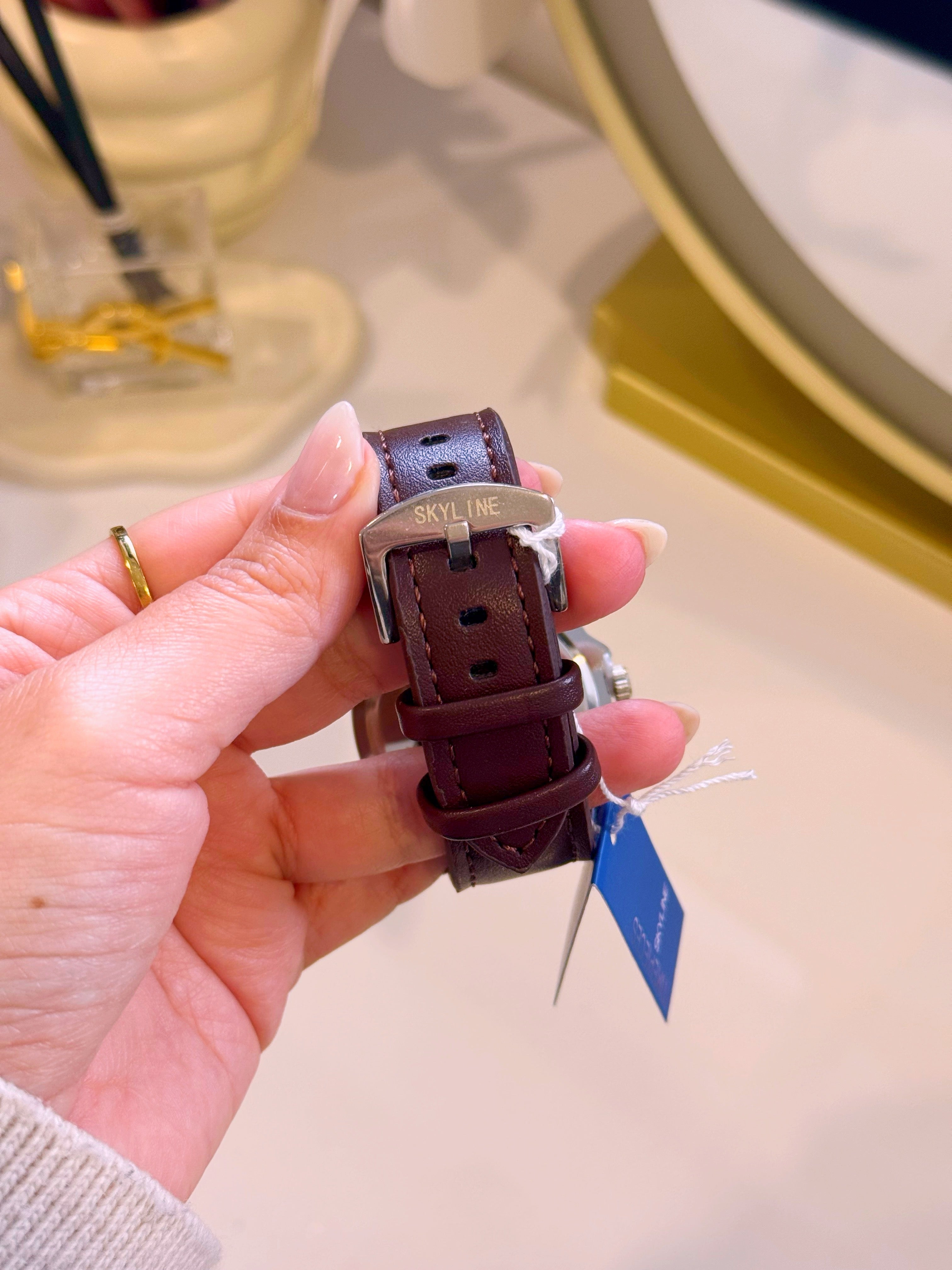 Relógio Skyline em pele, analógico e com mostrador interior para o dia.