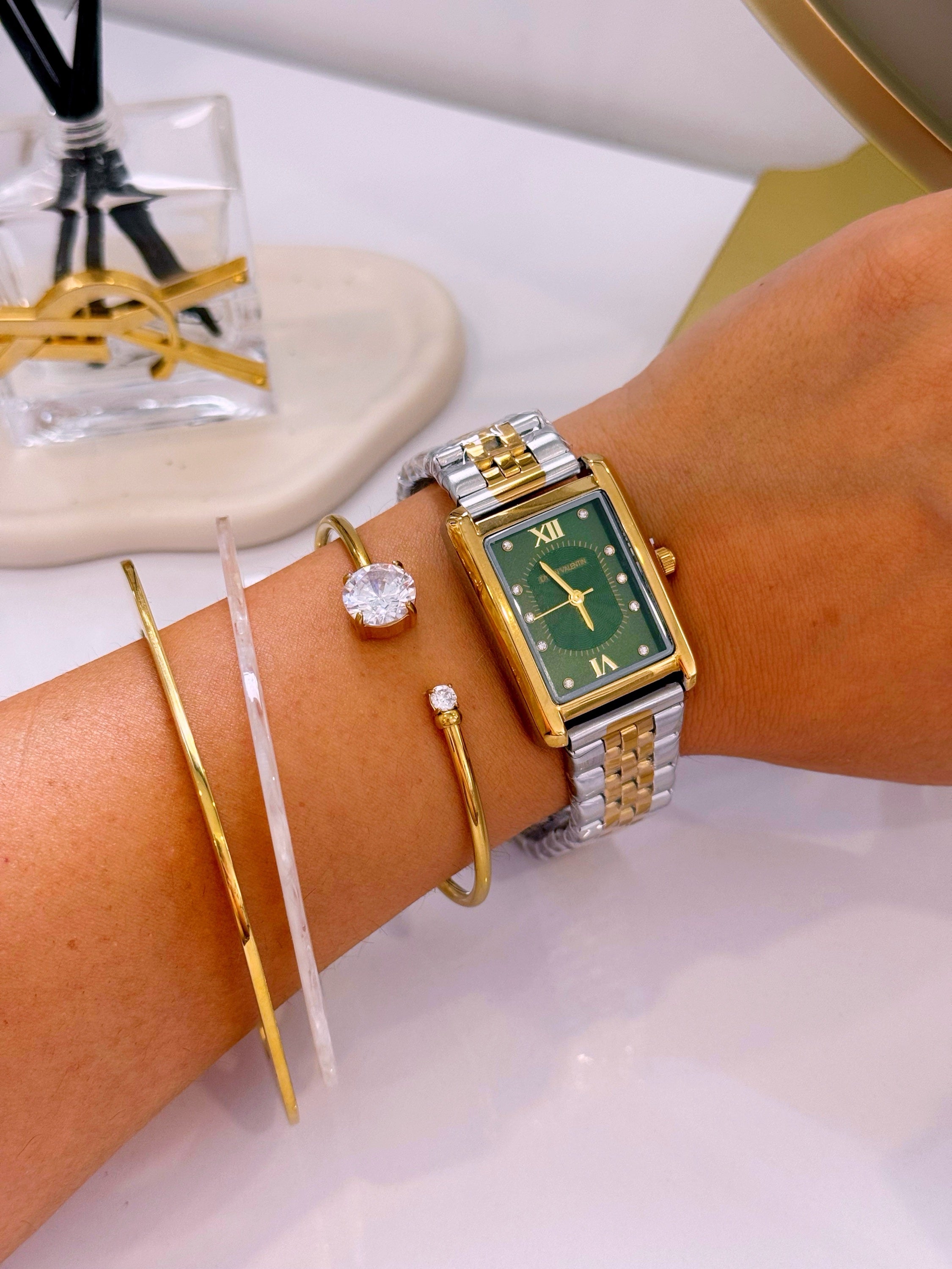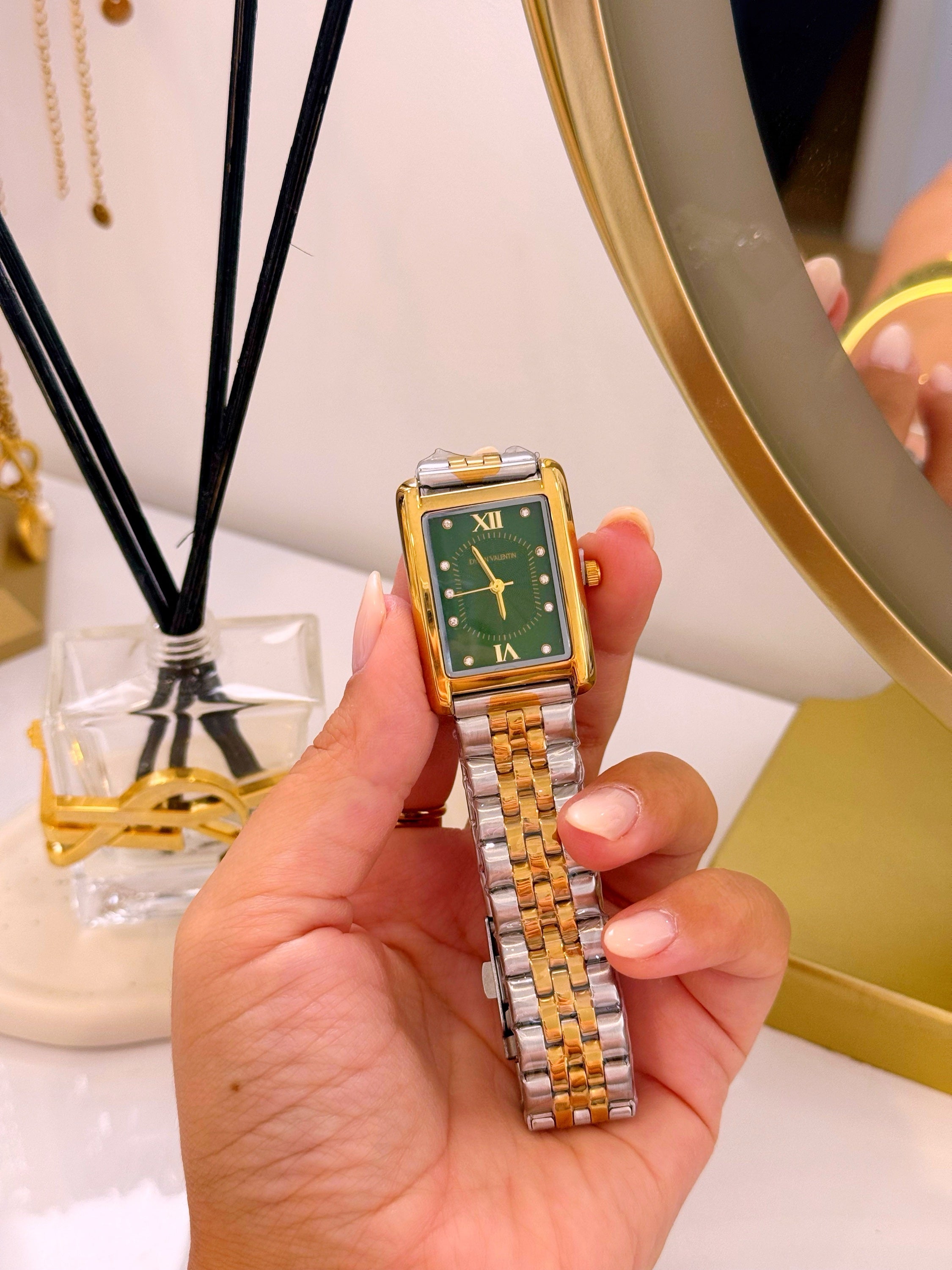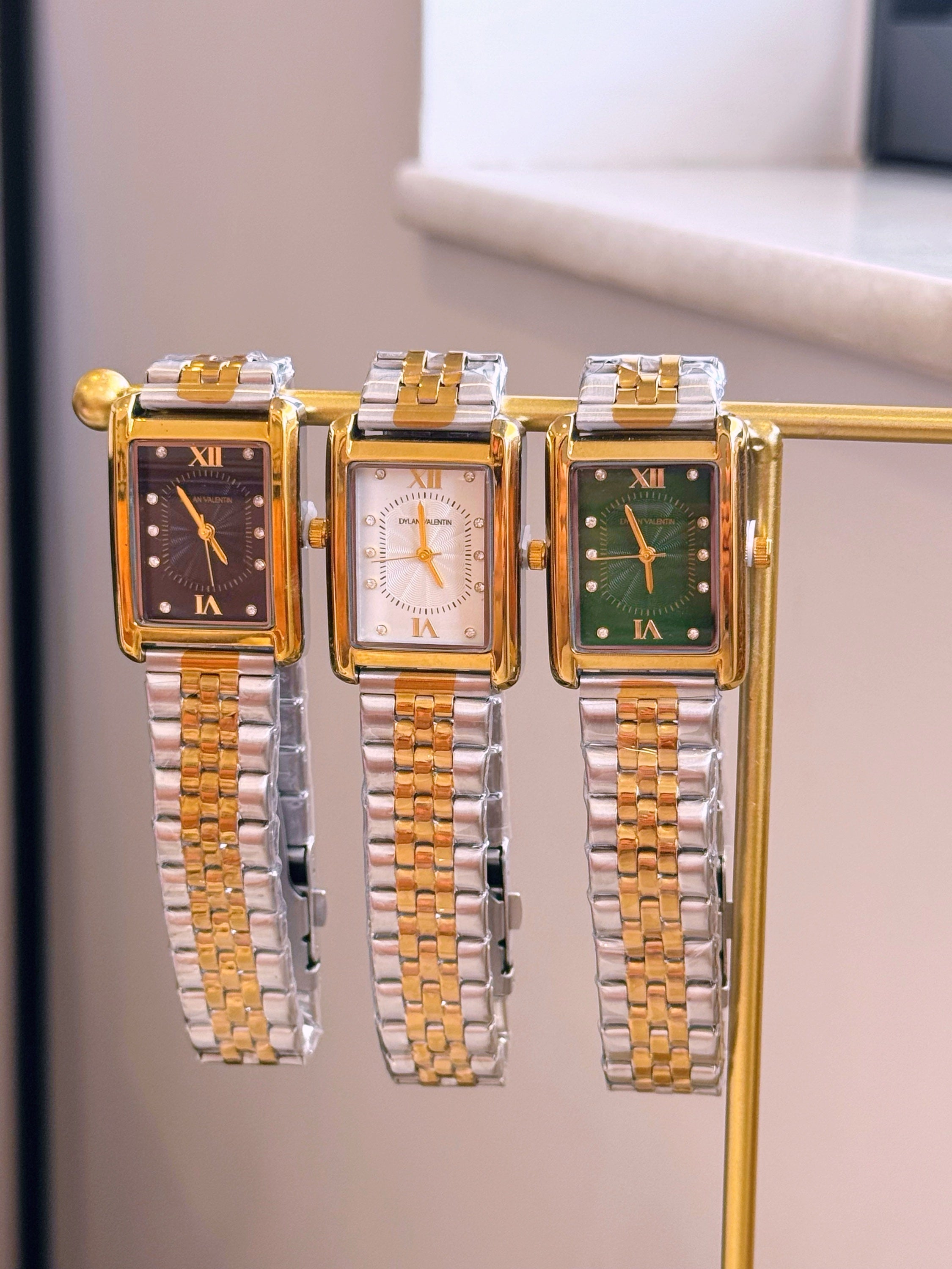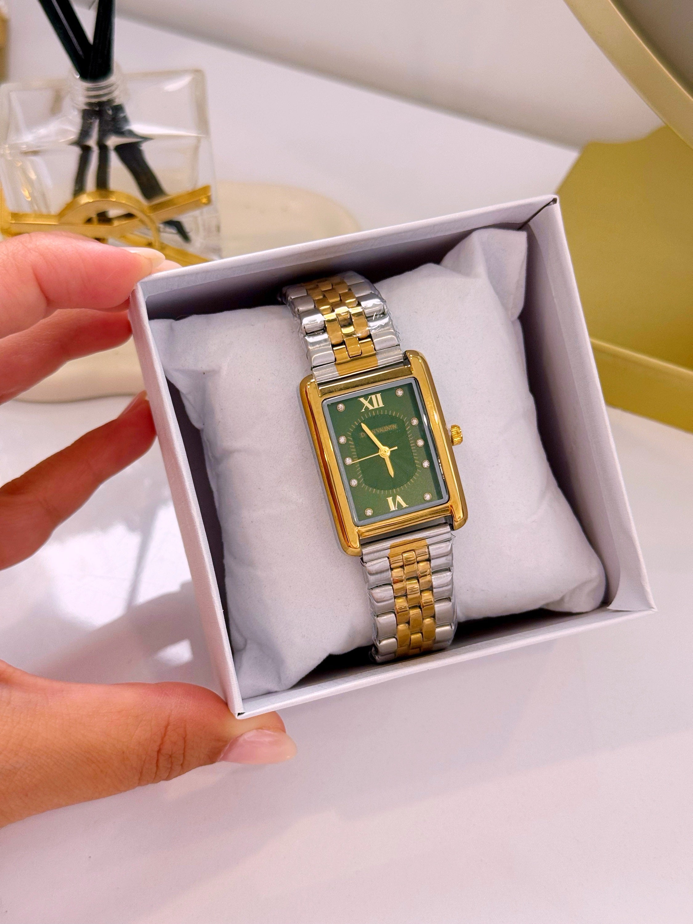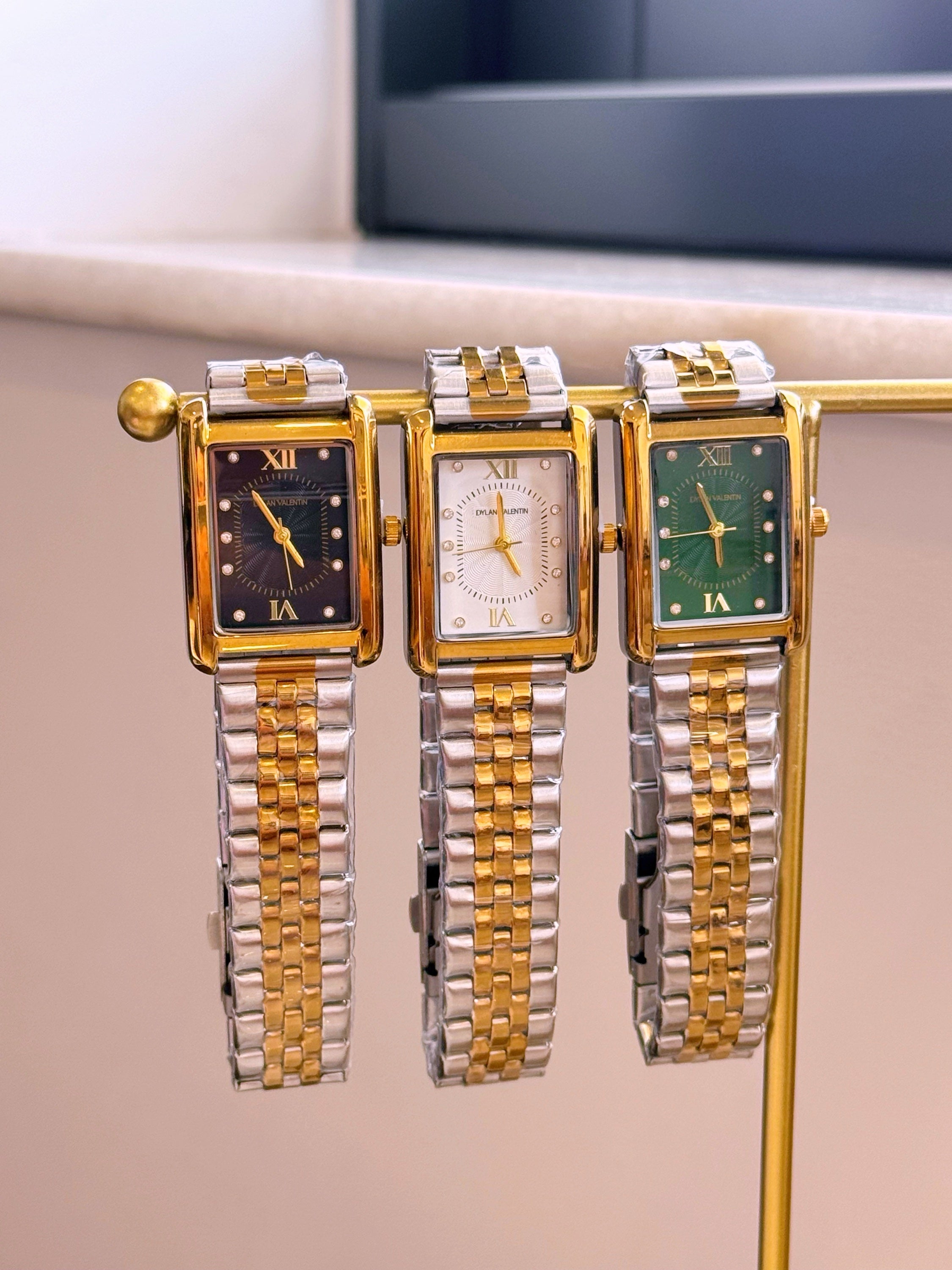 Relógio analógico mostrador retangular, marca Dylan Valentin. Modelo super tendência, clássico e intemporal. Com pormenores de brilhantes dentro do mostrador, e detalhes com relevos.