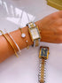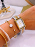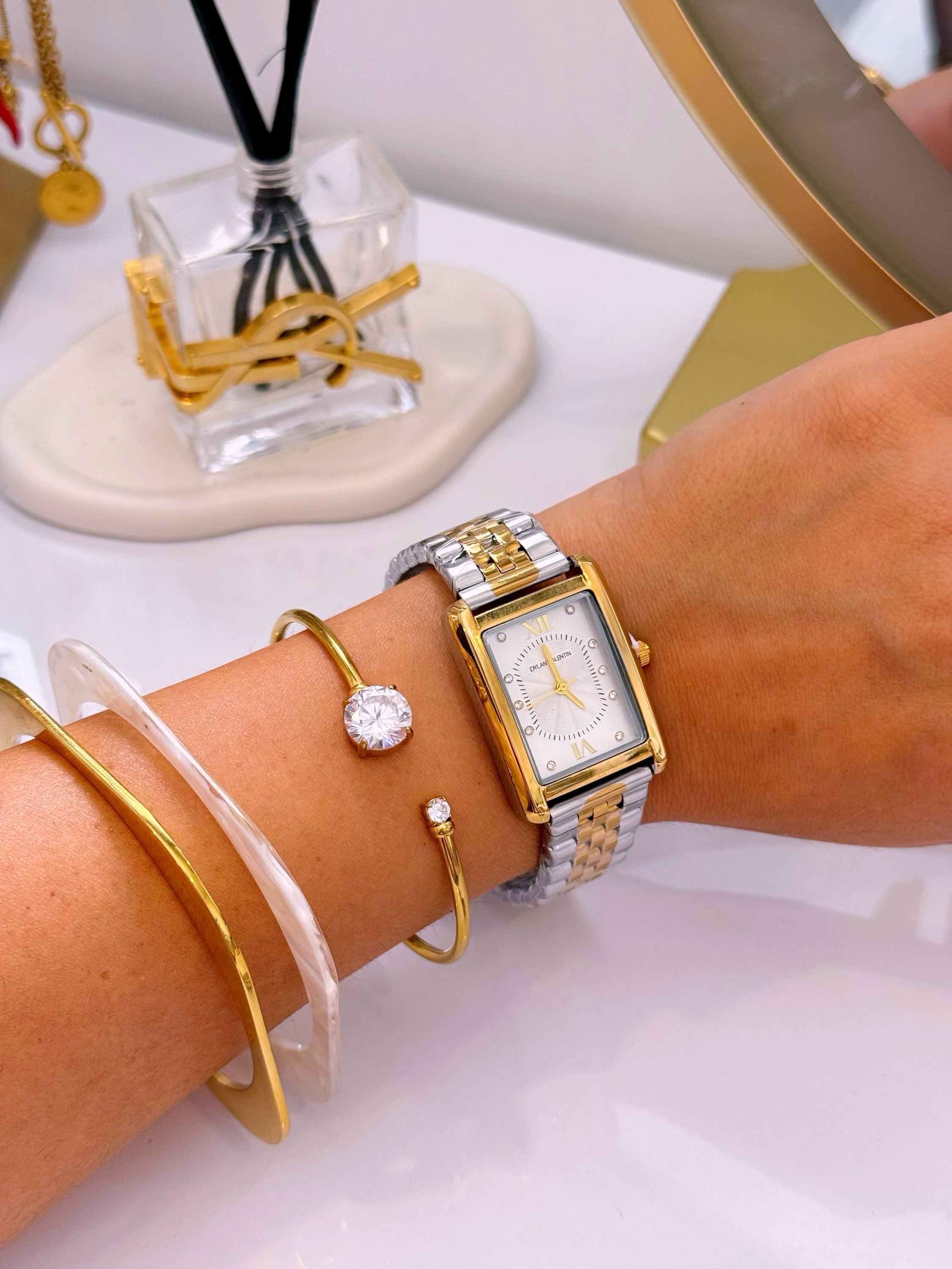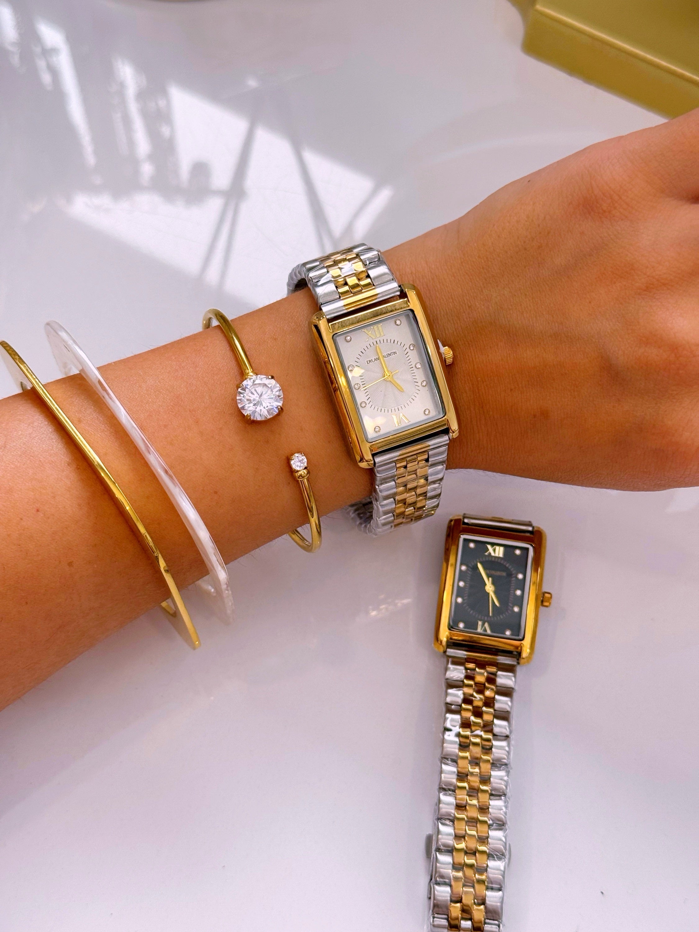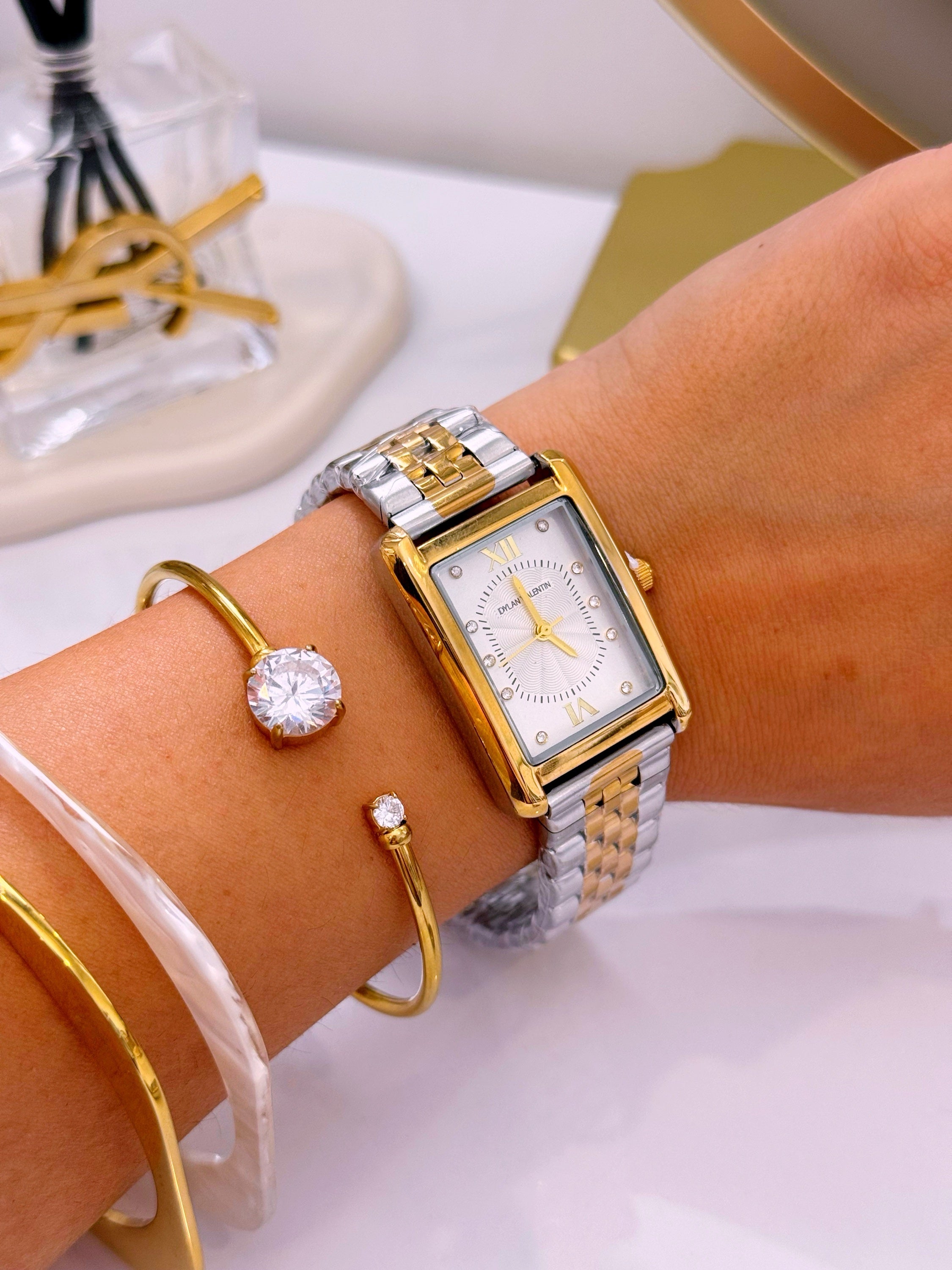 Relógio analógico mostrador retangular, marca Dylan Valentin. Modelo super tendência, clássico e intemporal. Com pormenores de brilhantes dentro do mostrador, e detalhes com relevos.