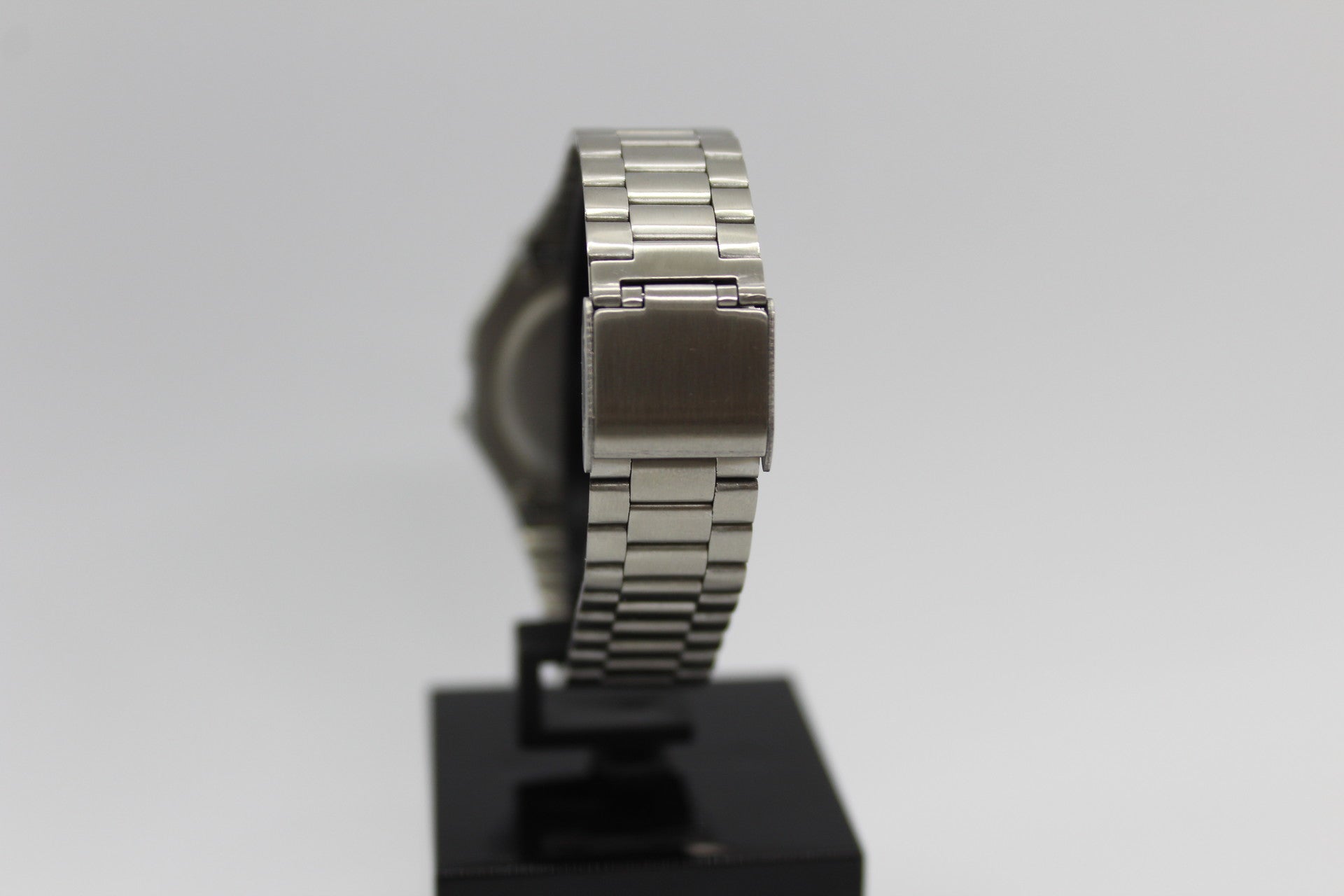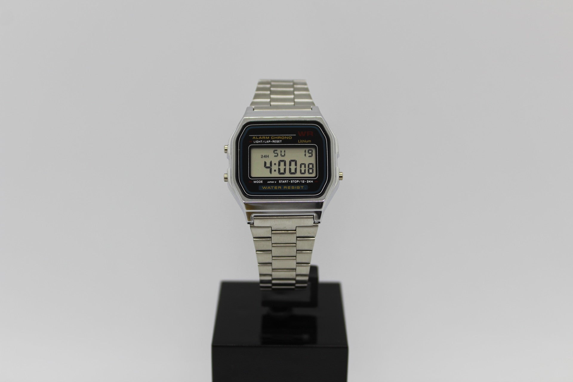 Relógio digital, funções: hora, dia, mês, alarme, luz e cronómetro.