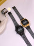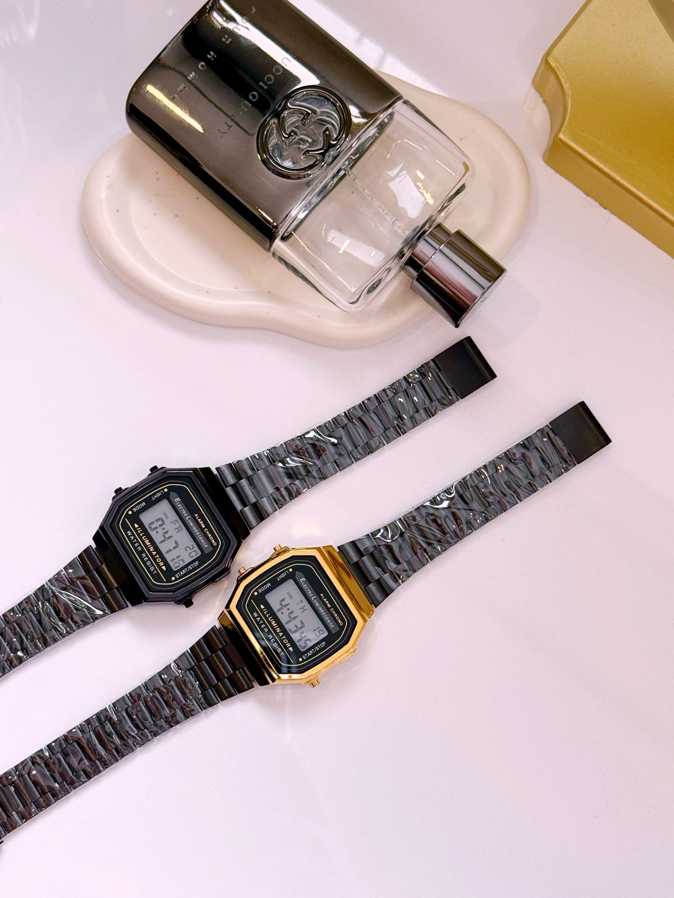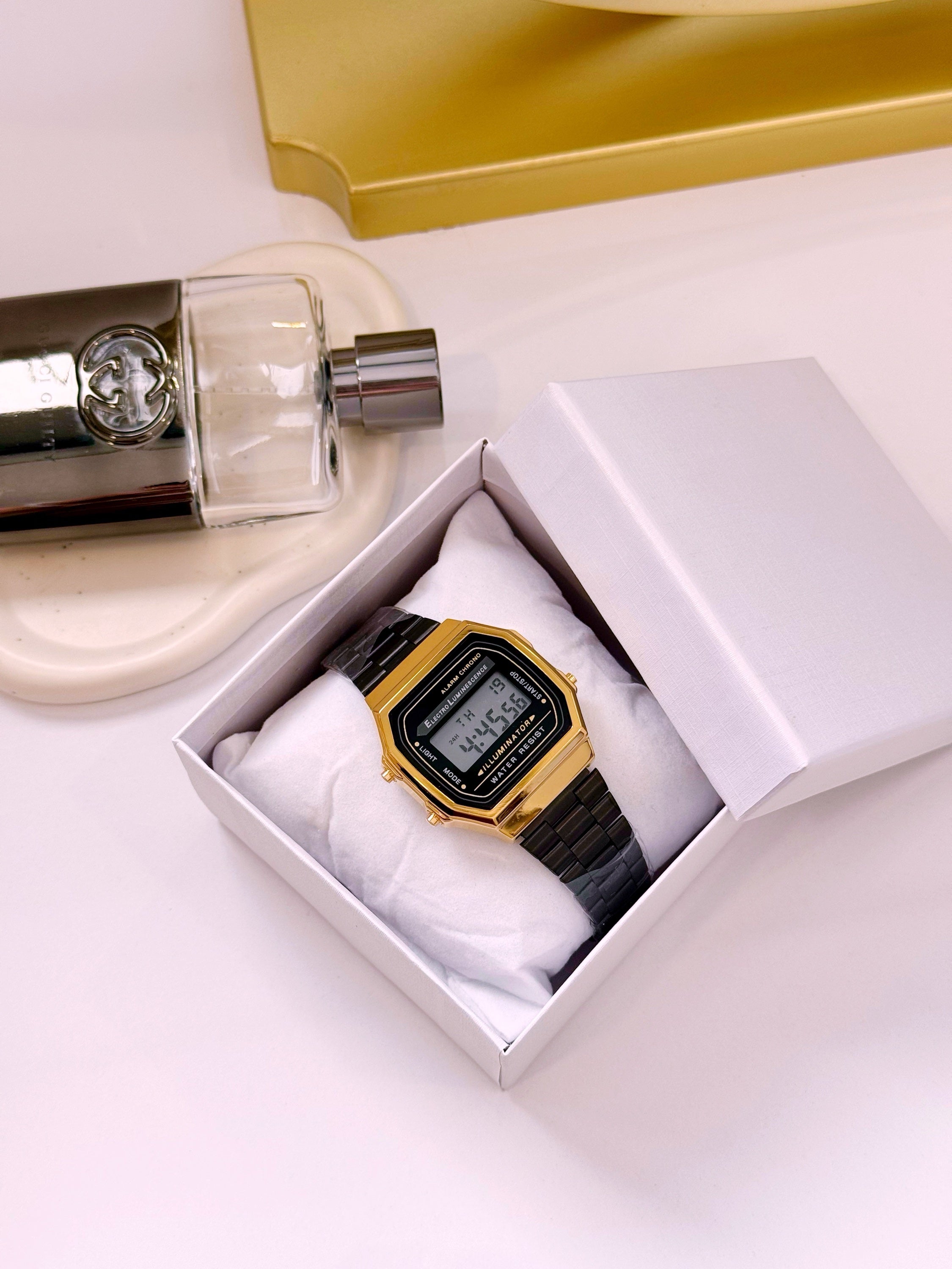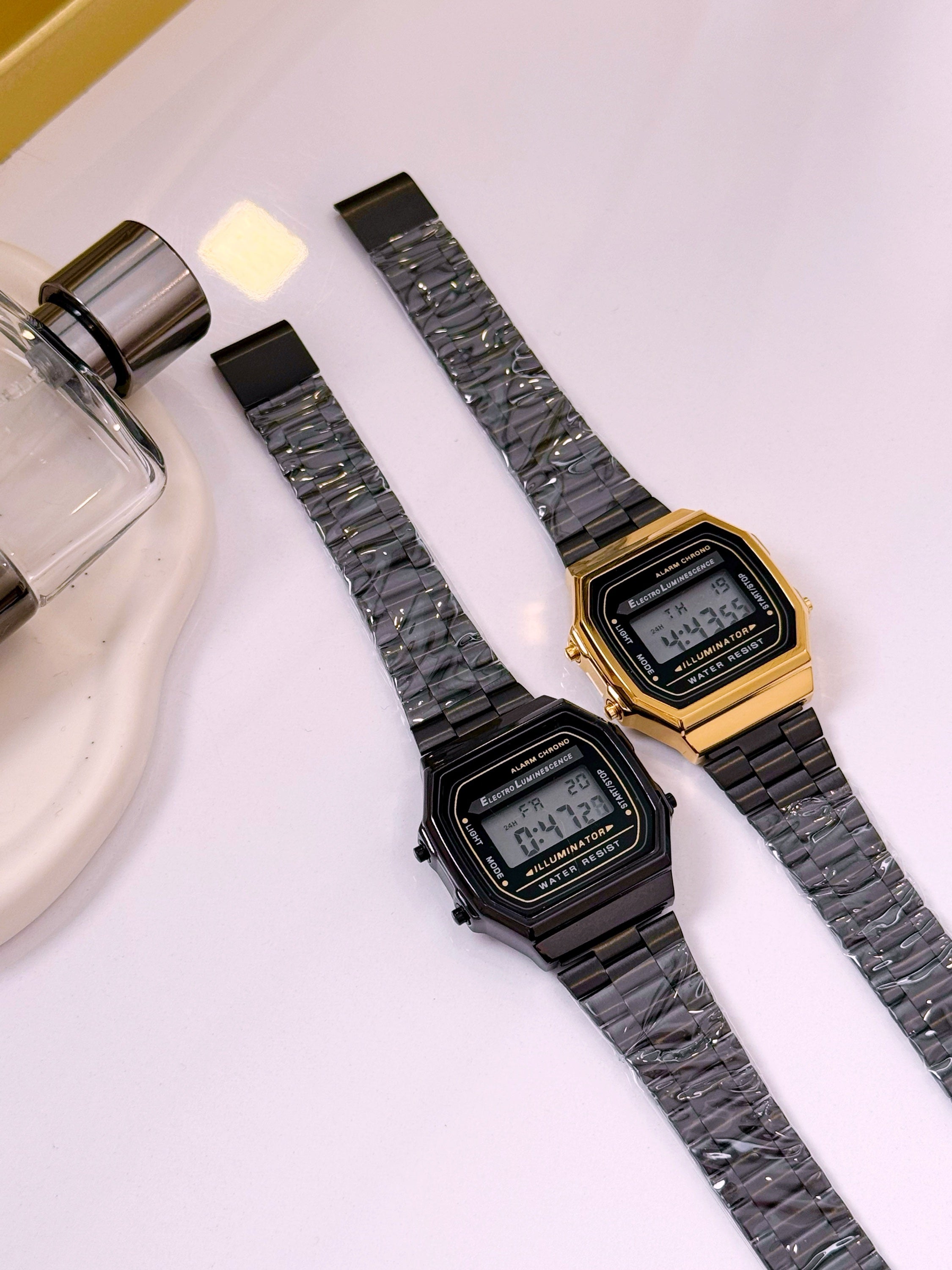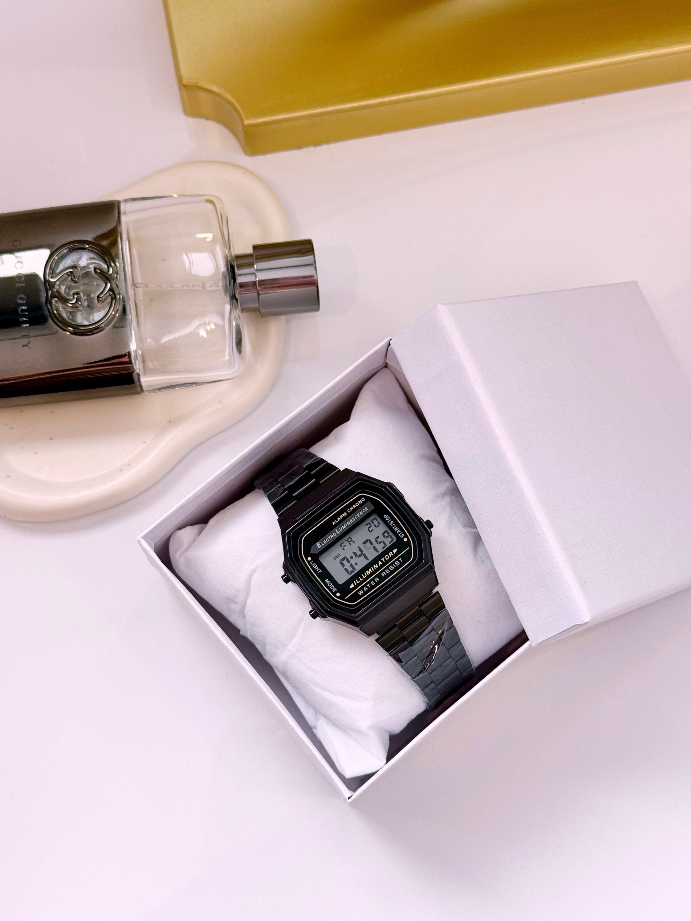 Relógio digital básico, funções: hora, dia, mês, alarme, luz e cronómetro.