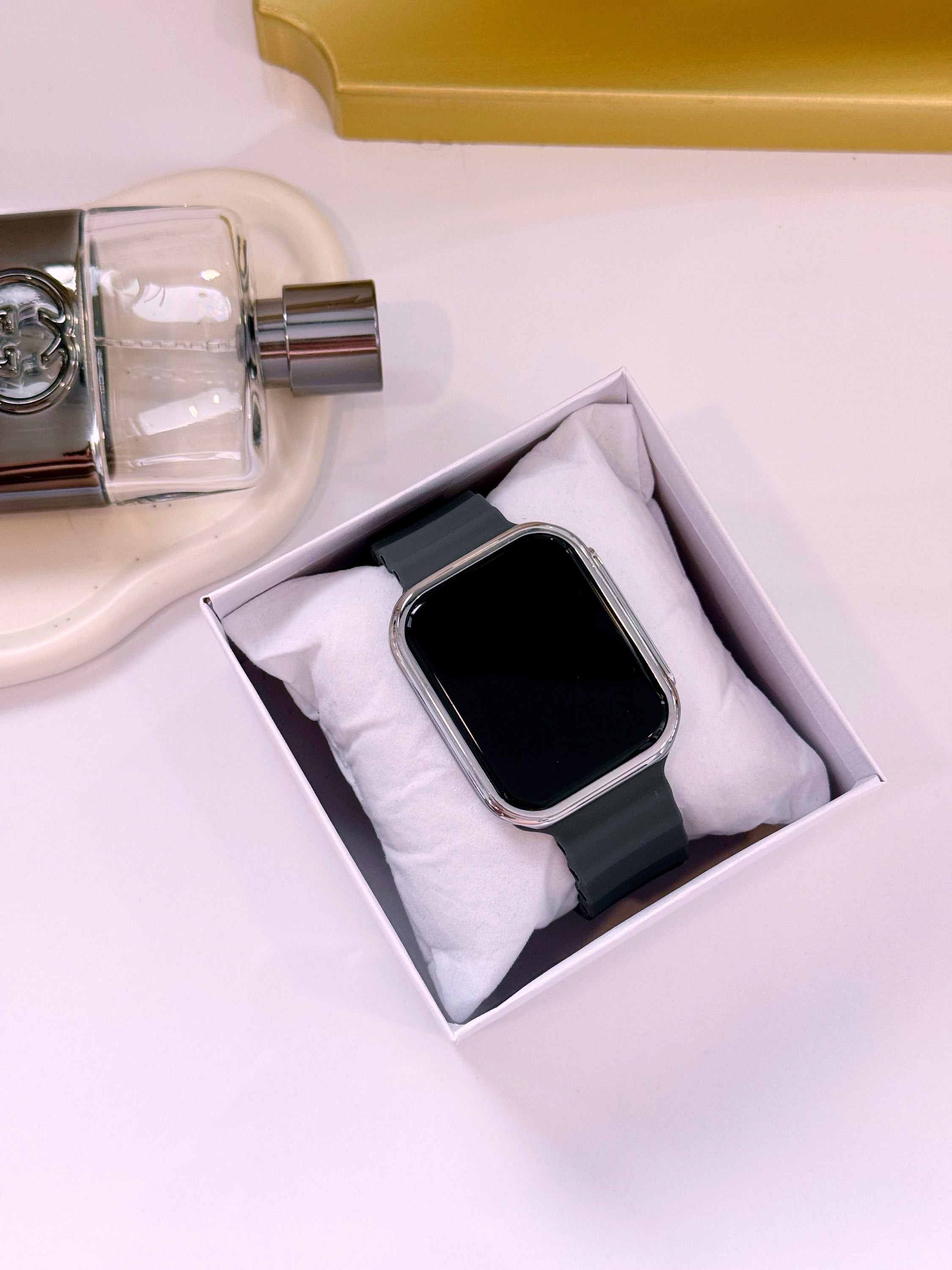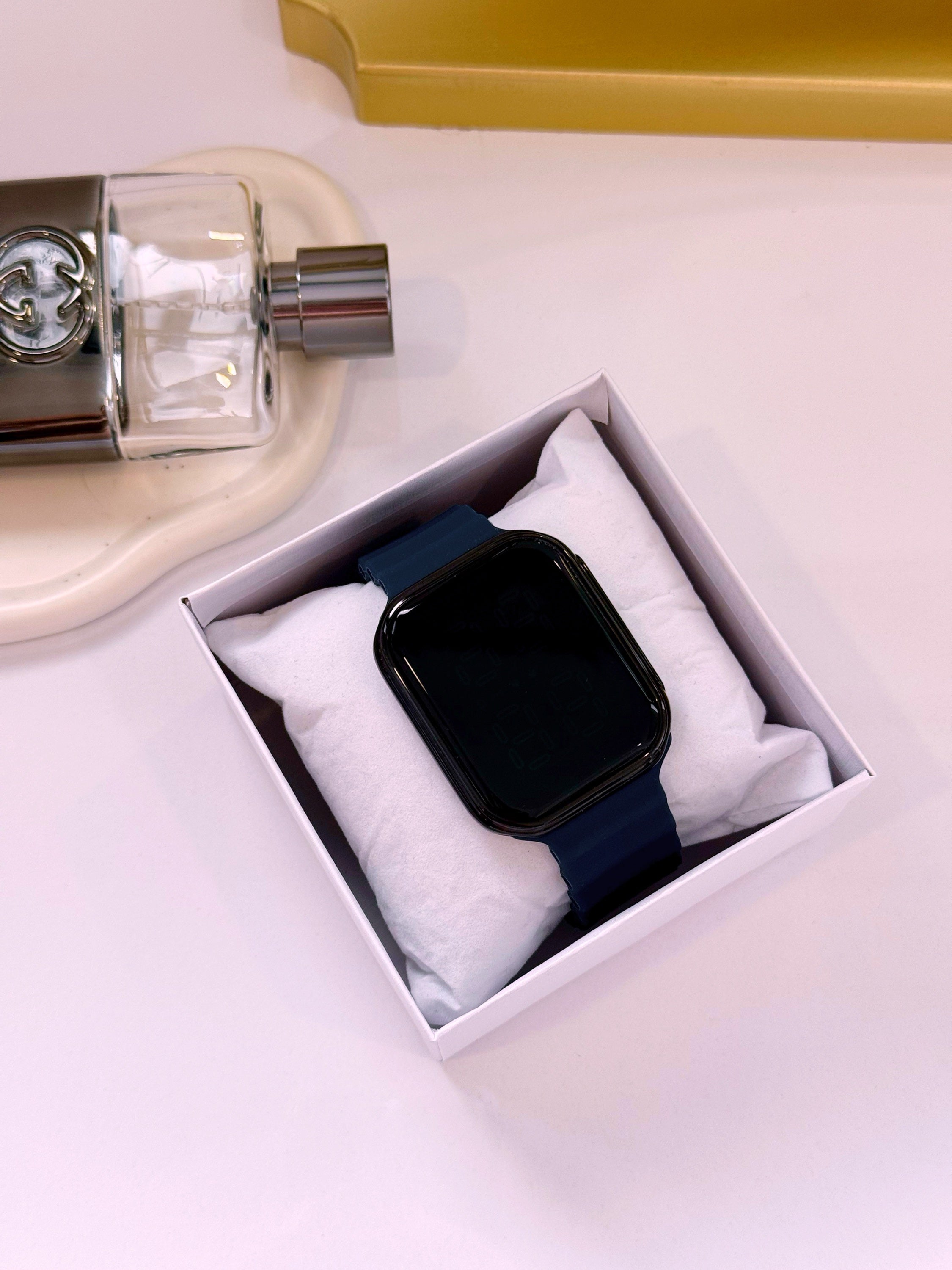 Relógio digital mostrador retangular, bracelete em silicone e mostrador touch.