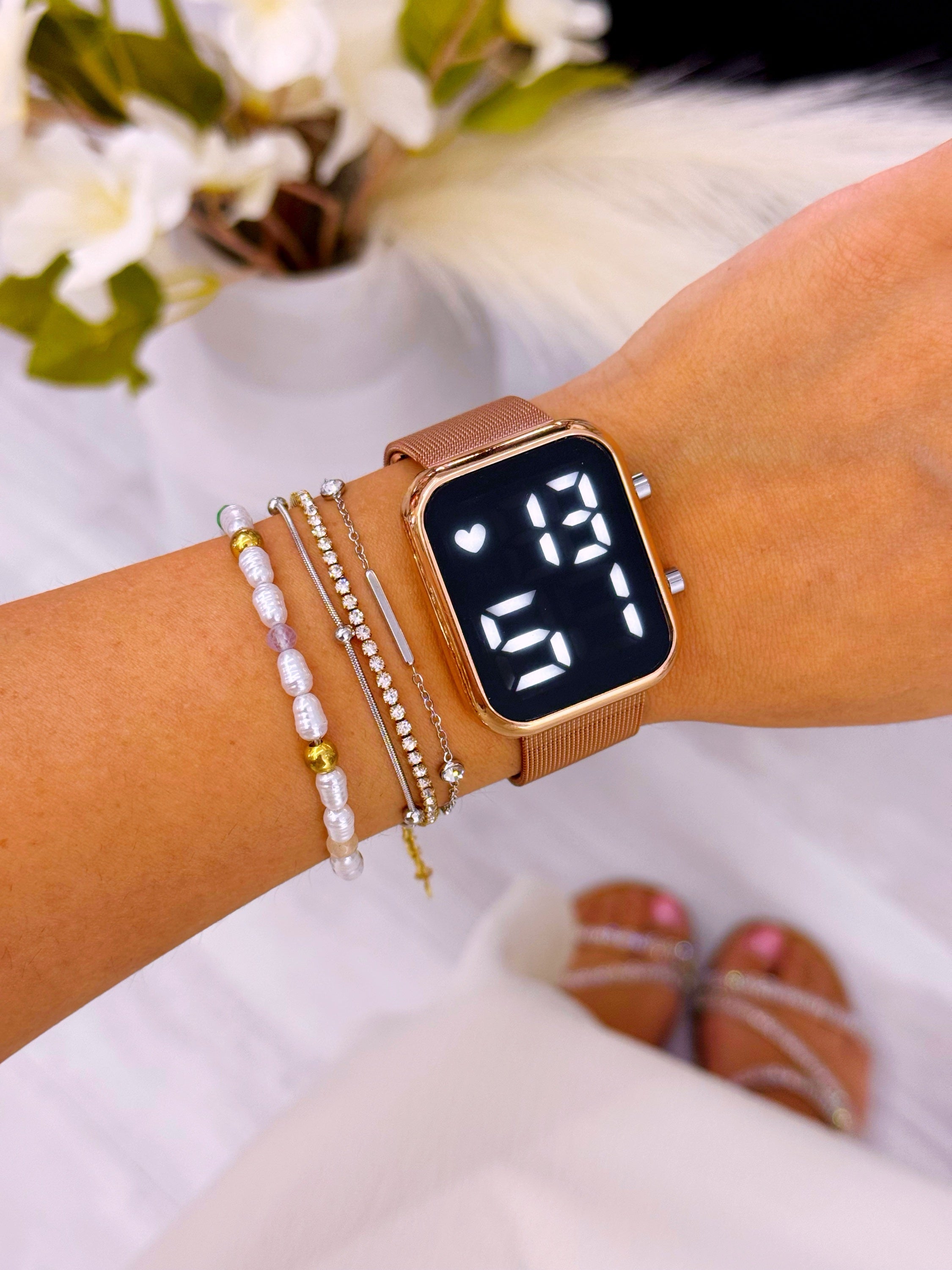 100% ajustável a qualquer pulso através de peça amovível na bracelete (não necessita de tirar elos e como tal dá para qualquer pulso), o mostrador mede aproximadamente 3,5 x 3 cm.