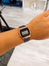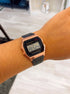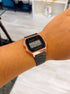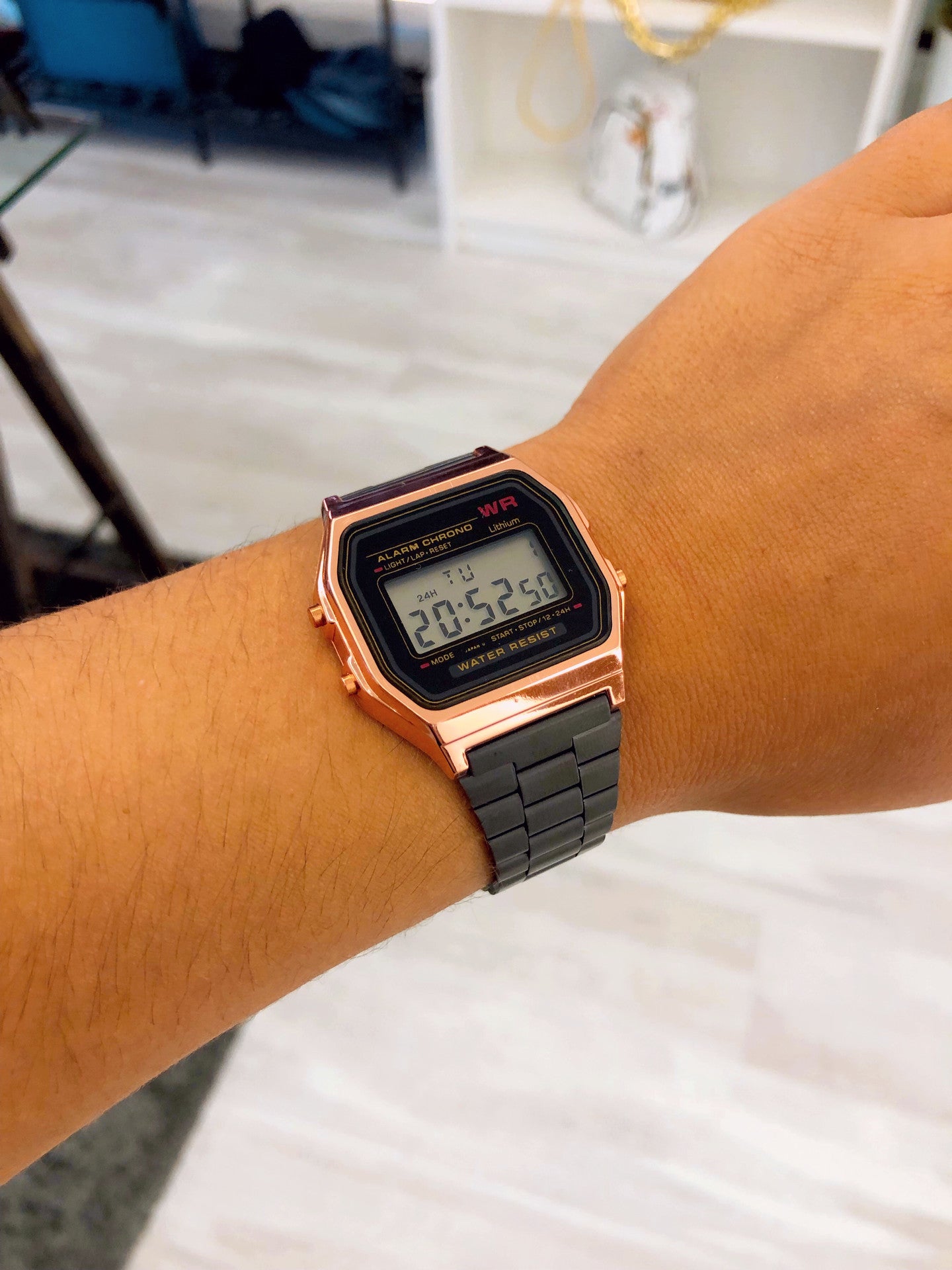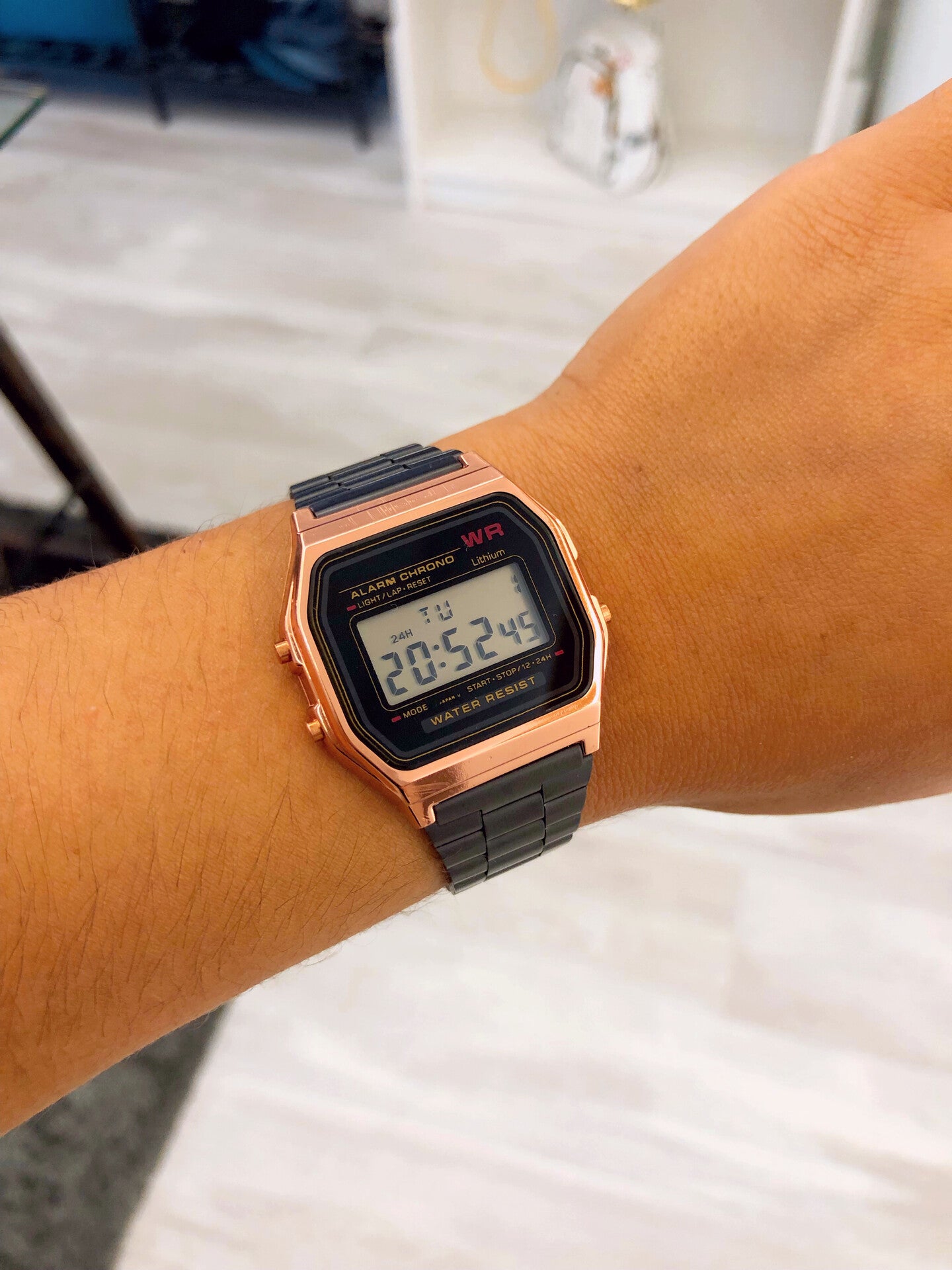 Relógio digital preto com pormenor rose gold, com mostrador em preto.