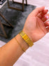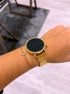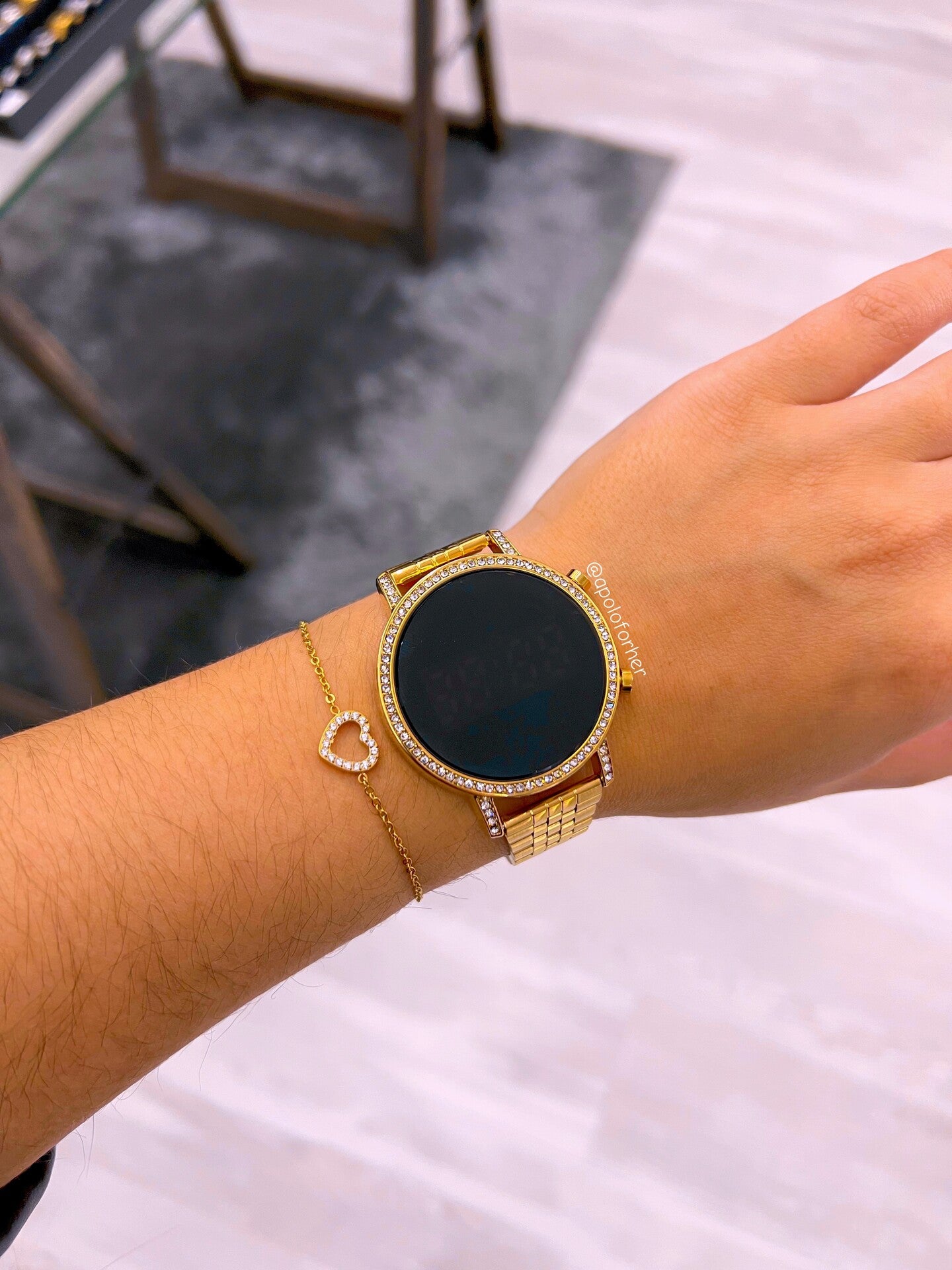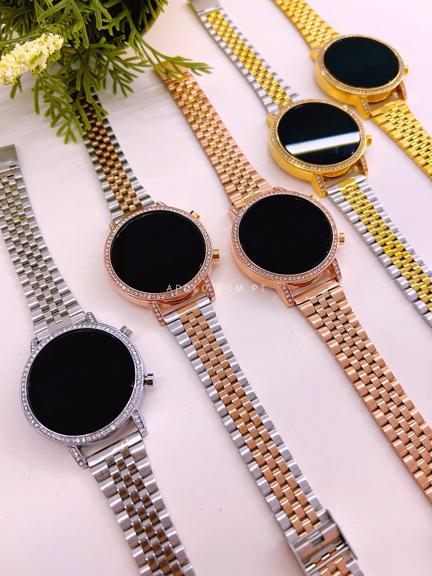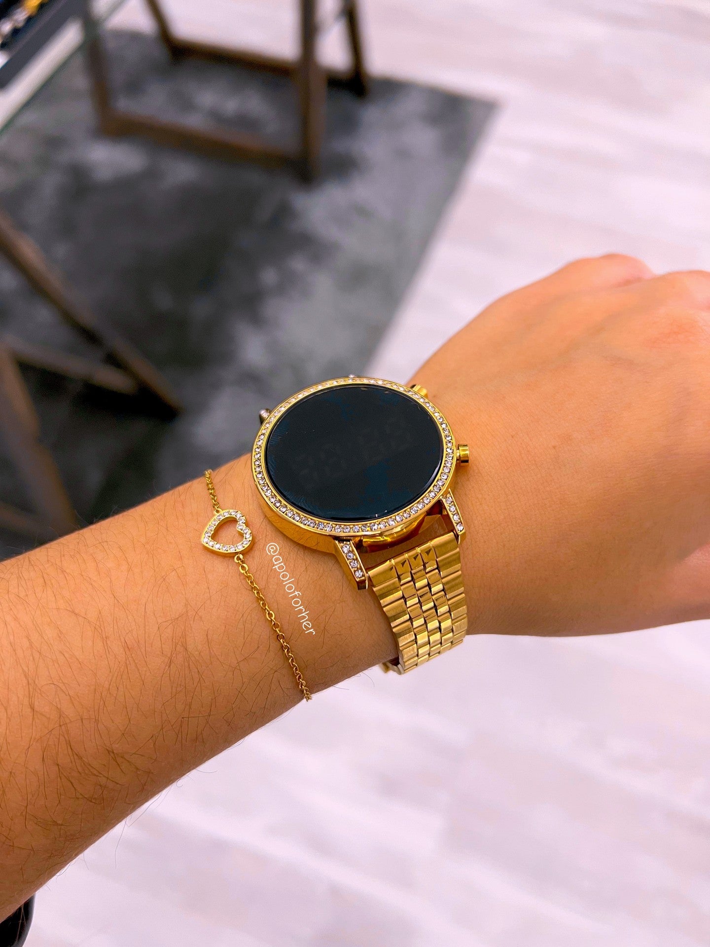 Relógio digital redondo com dois botões e brilhantes no mostrador.